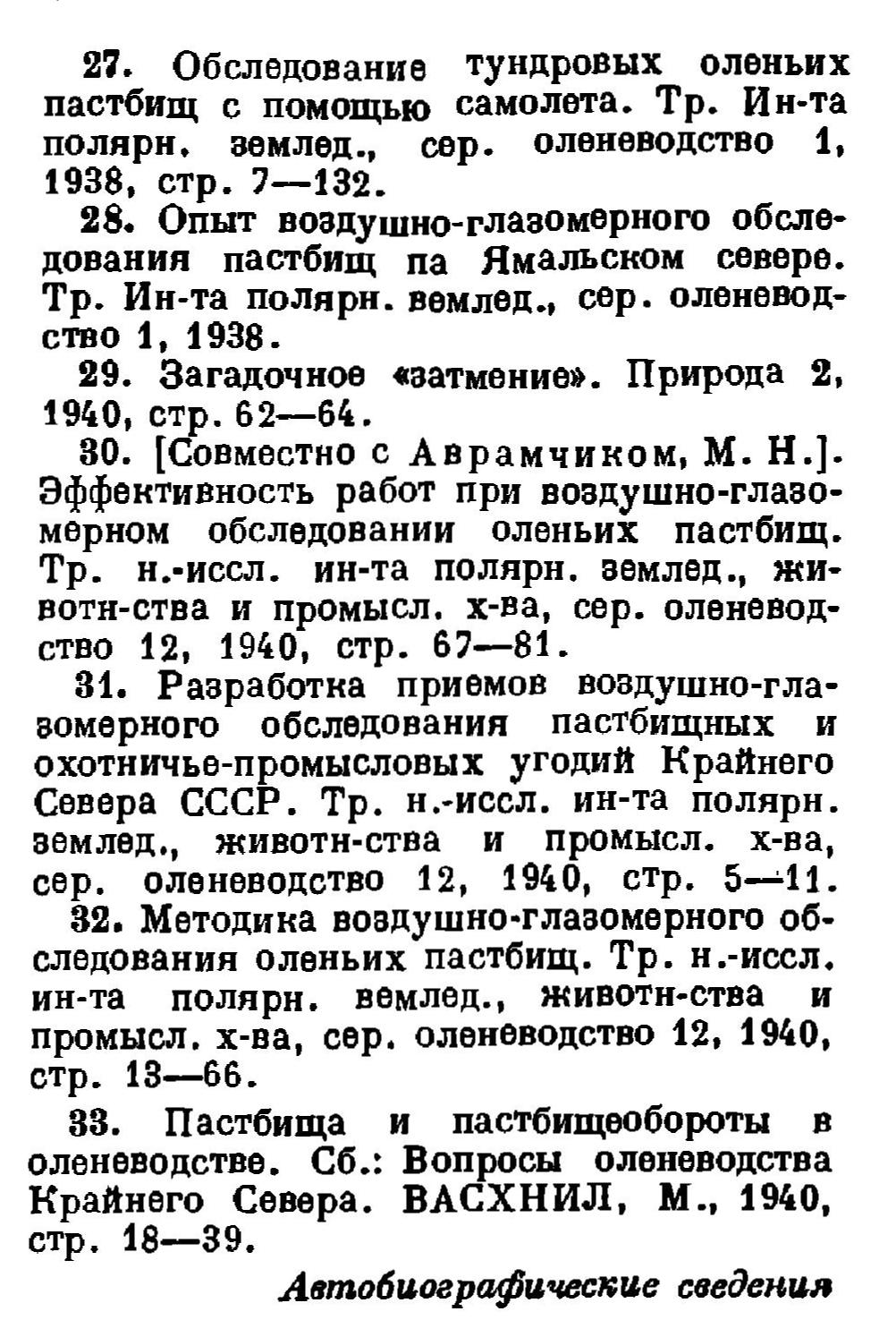 31. Разработка приемов воздушно-глазомерного обследования пастбищных и охотничье-промысловых угодий Крайнего Севера СССР. Тр. н. -иссл. ин-та полярн. землед., животн-ства и промысл. х-ва, сер. оленеводство 12, 1940, стр. 5—11.