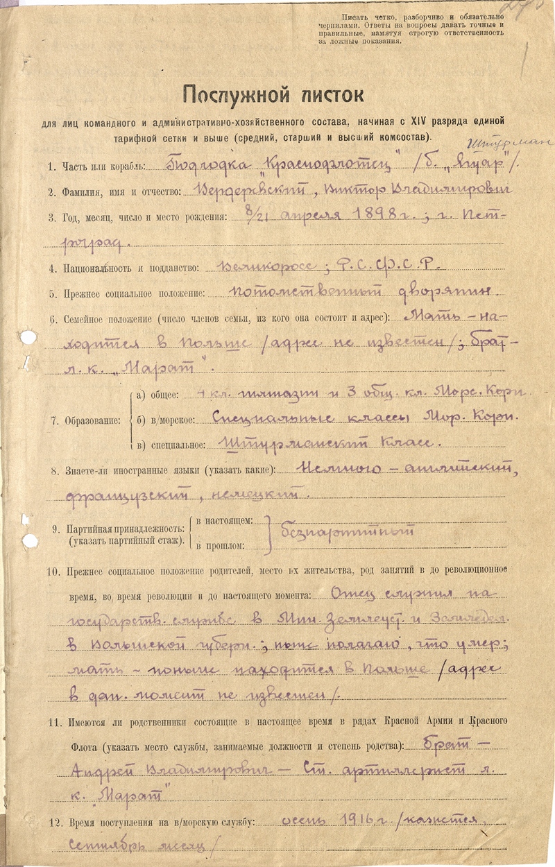 "Вердеревский Виктор Владимирович, из семьи морских офицеров, хорошо образованный, знающий иностранные языки.