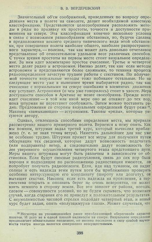 Значительный объем соображений, приведенных по вопросу опре­деления места в полете на самолете, делает необходимой известную классификацию. Представляется целесообразным расположить мето­ды в ряды по признаку их простоты, точности и доступности при­менения на севере. Эта классификация конечно несколько условна в связи с возможным разнообразием обстановки, но, будучи сделана в предположении некоего среднего типического вида этой обстанов­ки, при совершении полета наиболее общего, наиболее распространенного характера, — полезна, так как может дать довольно отчетливое представление об относительном удельном весе различных способов. С точки зрения простоты на первом месте стоит визуальное определе­ние. За ним идет элементарно простое счисление. Третье и четвертое место делят радио и астрономия. Именно делят, так как если методы астрономии и представляются более сложными, то техника процесса радиоопределения зачастую труднее работы с секстаном. По получаемой точности визуальные методы тоже побивают остальные. Но на следующее место уже в нынешнее время выбирается радио, так как счисление с нормальными на севере ошибками в элементах движения ему уступает. Астрономия (о чем уже говорилось) стоит в хвосте. Мера доступности способов в Арктике не менее своеобразна. Прежде всего идет счисление — в той или иной мере оно не откажет до тех пор, пока штурман не перестанет соображать. Затем можно поставить ра­дио. Предложения со стороны визуальных определений будут реже 32). Наконец "замыкающая" — астрономия. Таковы "ряды", которые ри­суются автору.