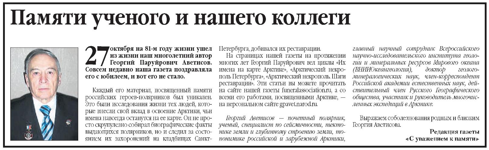 27 октября на 81-м году жизни ушел из жизни наш многолетний автор Георгий Паруйрович Аветисов. Совсем недавно наша газета поздравляла его с юбилеем, и вот его не стало.