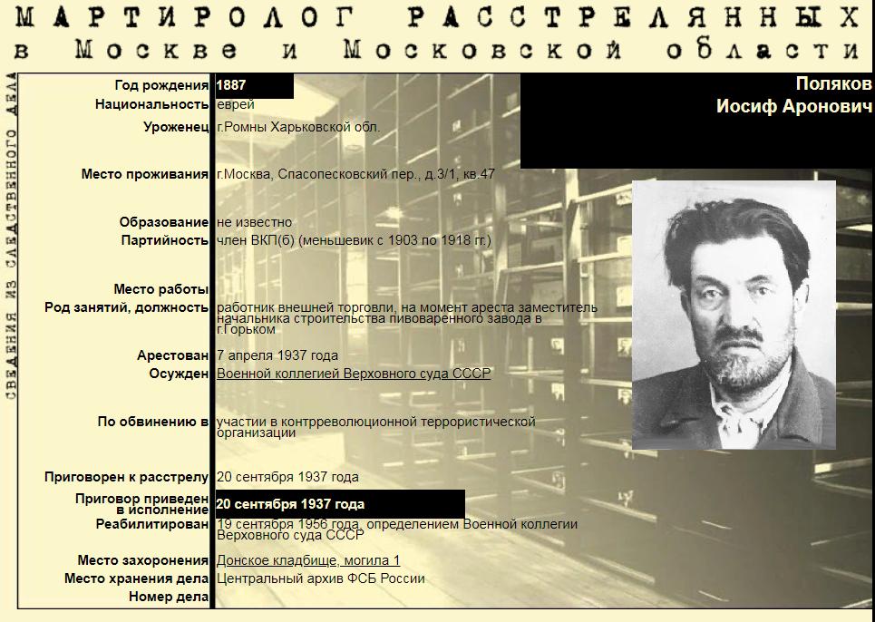 Иосиф Аронович Поляков был полностью реабилитирован в сентябре 1956 года за отсутствием состава преступления.
