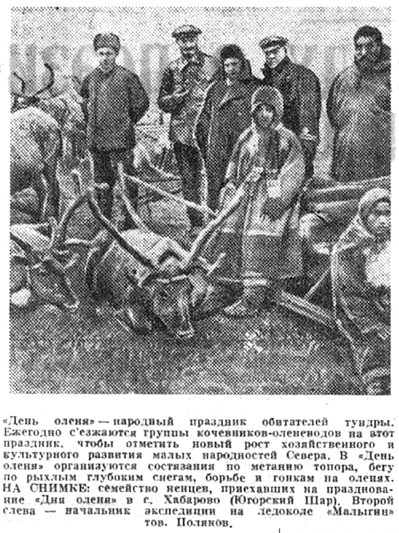 "День оленя" — народный праздник обитателей тундры. Ежегодно съезжаются группы кочевников-оленеводов на этот праздник, чтобы отметить новый рост хозяйственного и культурного развития малых народностей Севера. В "День оленя" организуются состязания по метанию топора, бегу по рыхлым глубоким снегам, борьбе и гонкам на оленях. НА СНИМКЕ: семейство ненцев, приехавших на празднование "Дня оленя" в с. Хабарово (Югорский Шар). Второй слева — начальник экспедиции на ледоколе «Малыгин» тов. Поляков.