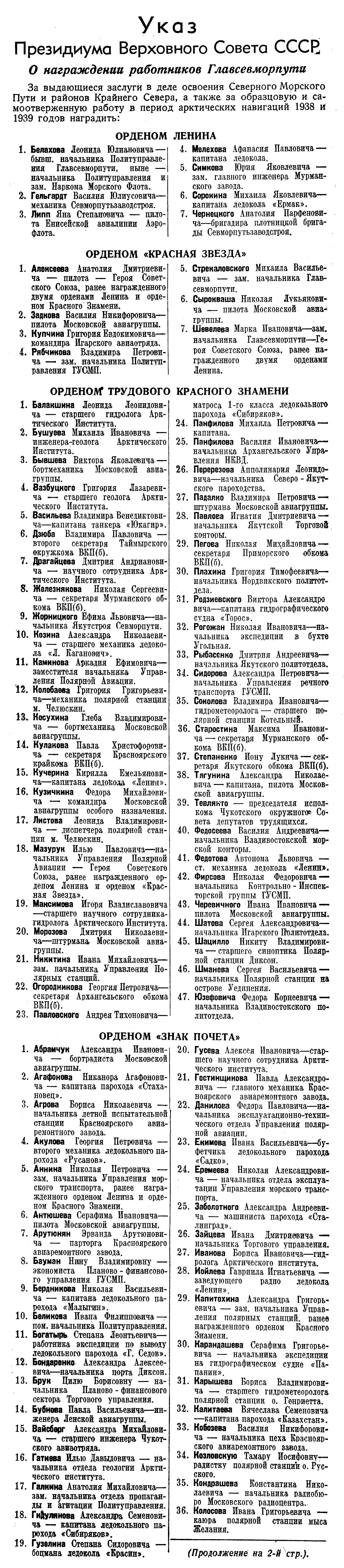 За выдающиеся заслуги в деле освоения Северного Морского Пути и районов Крайнего Севера, а также за образцовую и самоотверженную работу в период арктических навигаций 1938 и 1939 годов наградить: