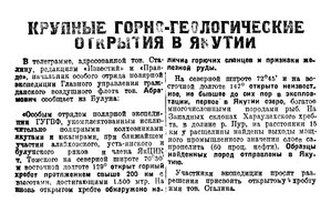 «Особым отрядом полярной экспедиции ГУГВФ, укомплектованным исключительно полярными колхозниками якутами и юкагирами, при ближайшем участии алайховского, усть-янского и булунского риков и члена ЯкЦИК т. Томского на северной широте 70°30' и восточной долготе 129° открыт горный хребет протяжением свыше 200 км с высотами, достигающими 1.500 мтр. На вновь открытом хребте обнаружено наличие горючих сланцев и признаки железной руды.