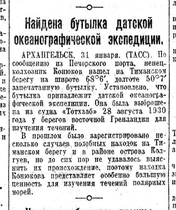 В Арктический институт поступили три открытки из буев, в свое время выброшенных в море Лаптевых и в Карском море с "Сибирякова", "Седова" и "Товарища Сталина" и найденных на северном побережье Исландии.
