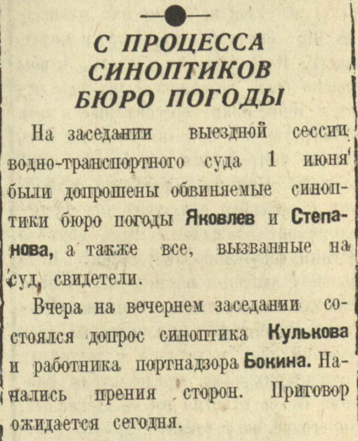 27 апреля 1936 года «Полярная правда» известила читателей о том, что «вскрыта безответственная, преступная система в работе мурманского бюро погоды… Следствие закончено, и виновники на днях предстанут перед пролетарским судом».