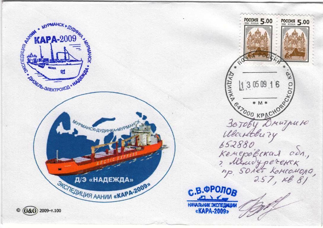 25 апреля 2009 года из Санкт-Петербурга в Мурманск отправилась группа ледоисследователей ААНИИ, участников экспедиции «Кара-2009», под руководством заведующего лабораторией ледового плавания Фролова С.В. Задача группы - провести комплекс ледоисследовательских работ и работ по оценке ледовых качеств нового дизель-электрохода «Надежда», принадлежащего ОАО «Норильский никель». Судно совершит испытательный переход из Мурманска в порт Дудинка и обратно.