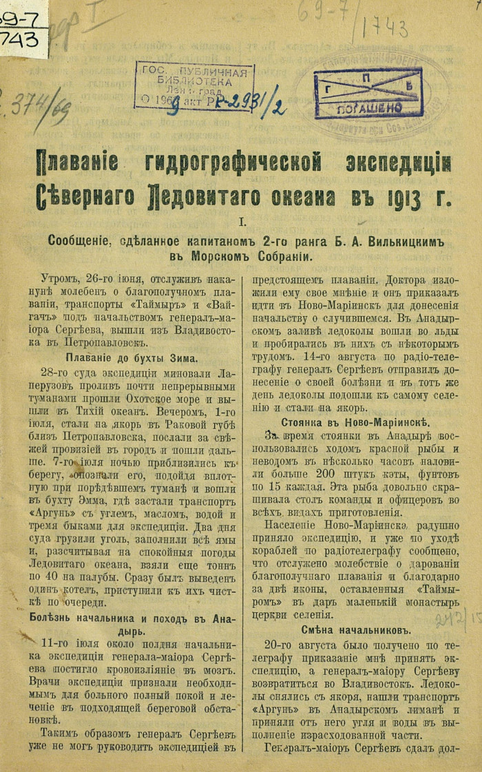 Вилькицкий, Б.А., Плавание Гидрографической экспедиции Северного Ледовитого океана в 1913 г. : Сообщ., сдел. кап. 2-го ранга Б.А. Вилькицким в Мор. собр., 26 с., 1 л. карт. ; 24., Владивосток, 1913.