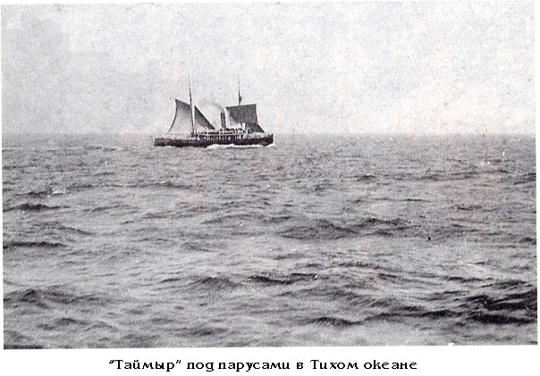 Ледовитый океан принял, мореплавателей ласково, ветер был слабый, светило солнце, льдов не было видно и только киты, выплывающие то там, то здесь, разрушали иллюзию теплого моря. Но уже наследующий день ветер засвежел, размахи качки дошли до 400 на борт, а вечером того же дни транспорты вошли в редкий лед. Океан поспешил показать свой суровый характер. Неожиданно "Таймыр" увидел стоящий у льдины норвежский пароход, промышляющий моржей и уже успевший их набить около 700 штук. "Таймыр" передал ему почту, дал поправку хронометра, снабдил свежей кетой, пойманной в Анадыре и пошел дальше.