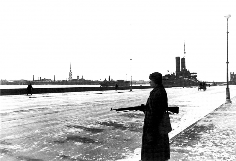 О "Ермаке" я что-то не подумал,не знал что он тоже блокаду переживал на Неве. А часовой-по моему милиционер или из вспомогательных частей-у него кажется тёмная шинель. А винтовка-обычный карабин Мосина. Для СВТ не видно газоотводной трубки.