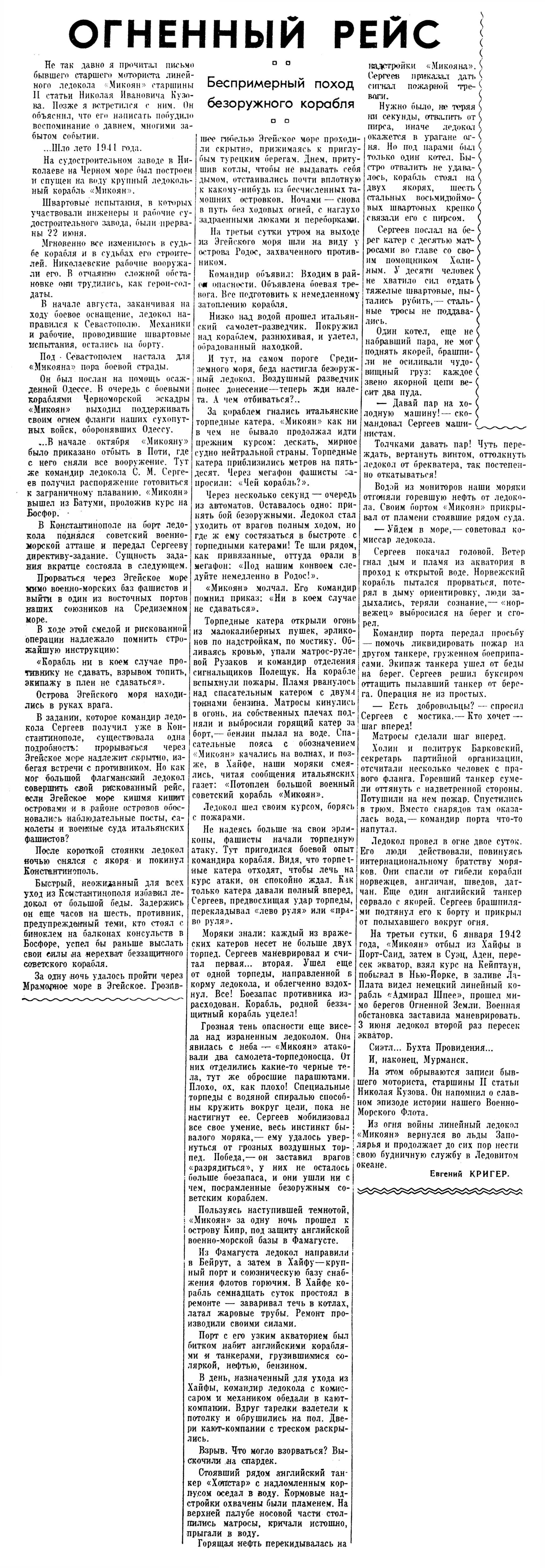 Не так давно я прочитал письмо бывшего старшего моториста линейного ледокола «Микоян» старшины II статьи Николая Ивановича Кузова. Позже я встретился с ним. Он объяснил, что его написать побудило воспоминание о давнем, многими забытом событии.