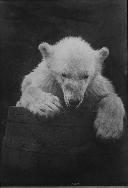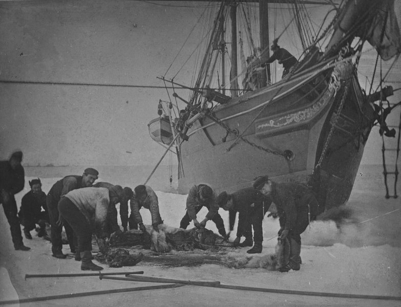 Summary text: The crew of the sailing ship ‘Eira’ dismember a polar bear on the ice at. . the bows of the ‘Eira’ which is moored to the ice. A crew member stands on deck. . watching.