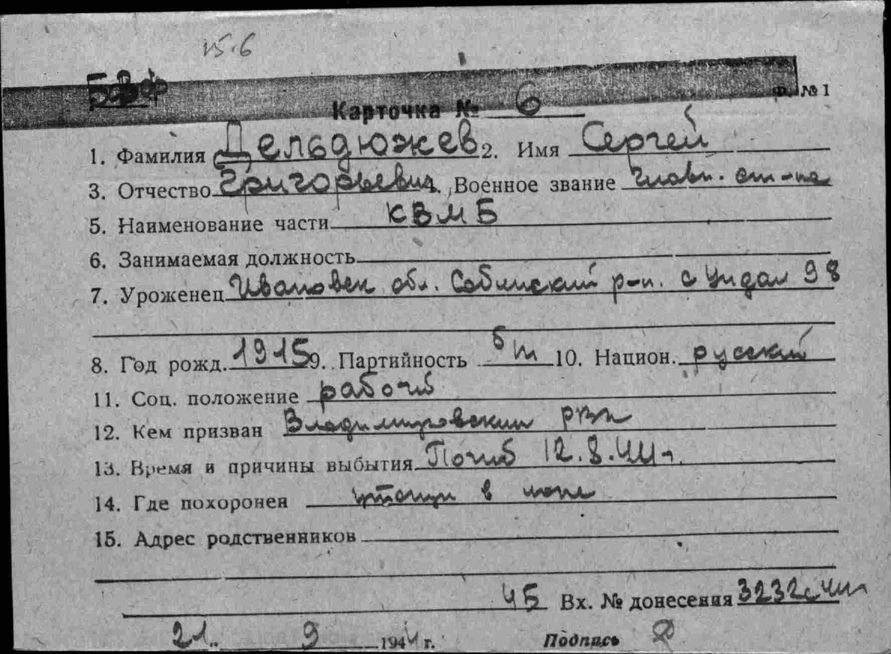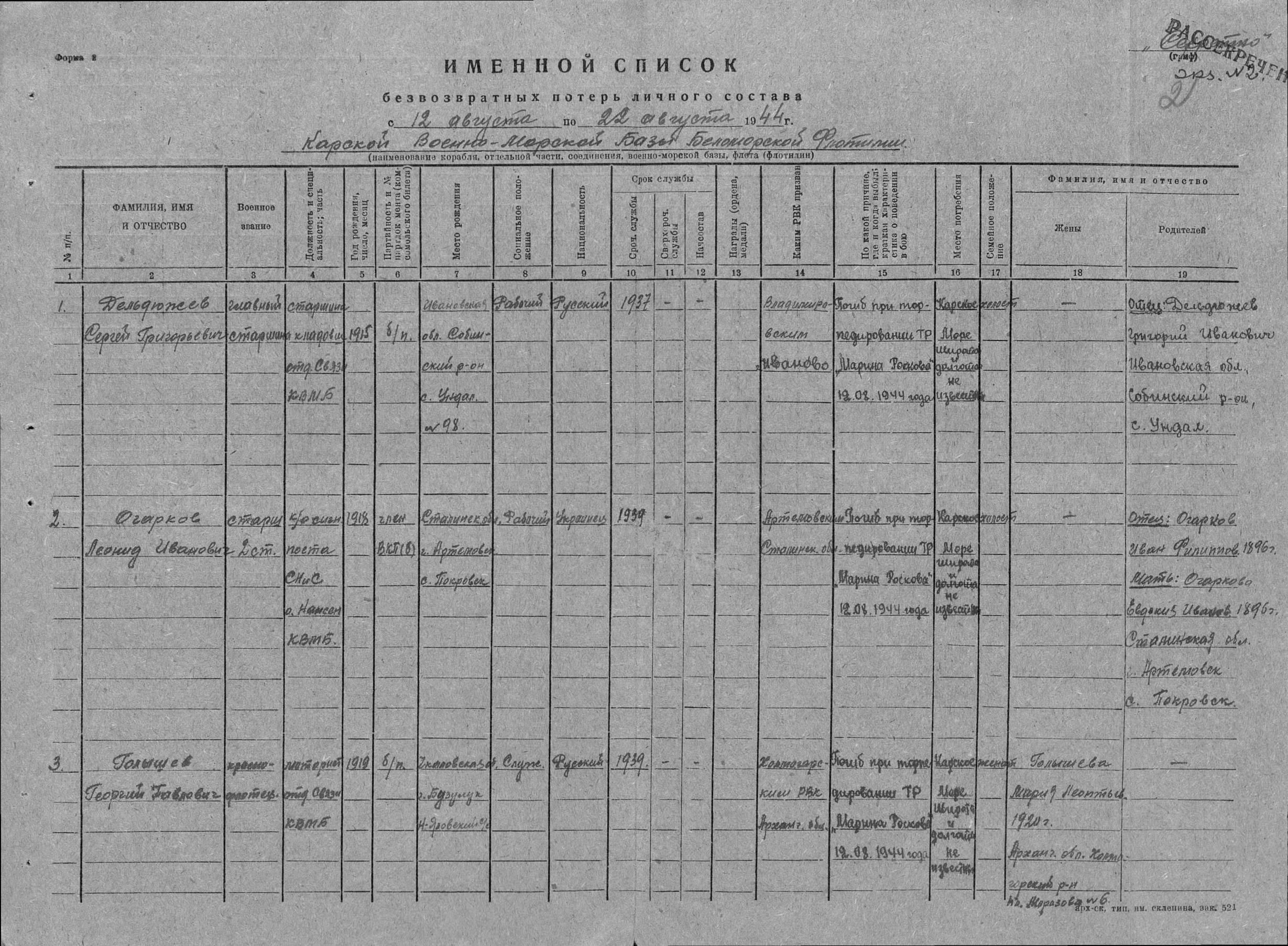 152. Дельдюжов Сергей Григорьевич, пассажир транспорта «Марина Раскова», воинское звание – главный старшина; должность, специальность, часть – старшина, кладовщик отделения связи, Карская военно-морская база; дата рождения – 1915 г.; партийность и № партдокумента (комсомольского билета) – беспартийный; место рождения – Ивановская обл., Собинский р-н, с. Ундол 98; социальное положение – рабочий; национальность – русский; срок срочной службы – 1938 (1937) г.; каким РВК призван – Владимировским РВК; по какой причине, где и когда выбыл, краткая характеристика о поведении в бою – погиб при гибели корабля в Карском море 12.08.1944 г.; семейное положение – холост; родственники (фамилия, имя, отчество, адрес) – отец: Дельдюжев Григорий Иванович, Ивановская обл., Собинский р-н, с. Ундол.