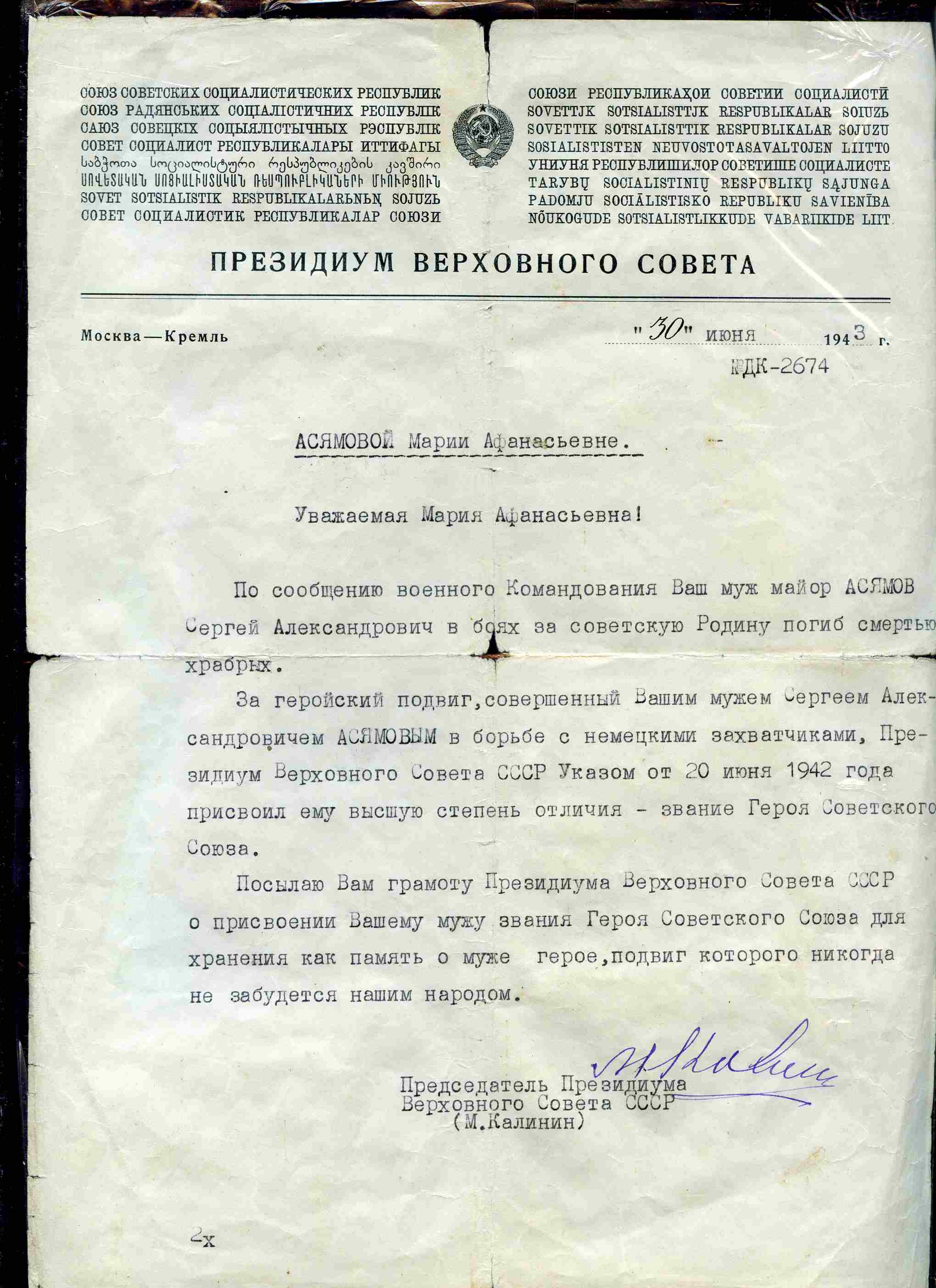 20.06.42 г. С.А.Асямову присвоено звание Героя Советского Союза.