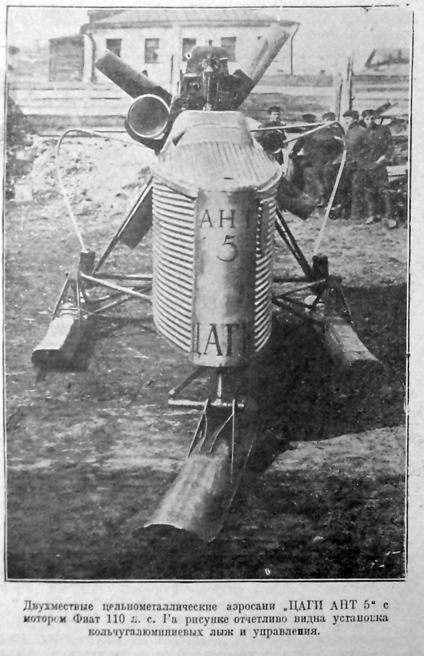 1) малая двухместная машина «ЦАГИ АНТ» с мотором Анзани 35 л. с, построенная из дерева и