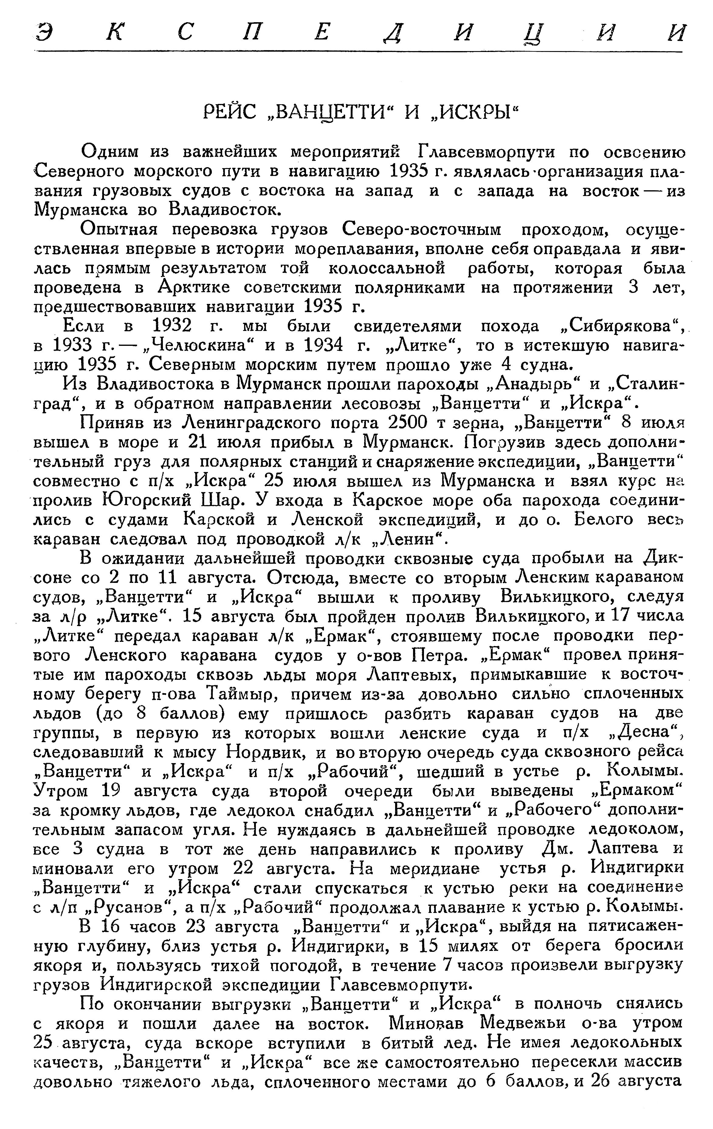 Важнейшим событием навигации 1935 года является плавание "Анадыря" и "Сталинграда" из Владивостока в Мурманск и лесовозов "Ванцетти" и "Искры"—в обратном направлении. Этими четырьмя грузовыми пароходами осуществлено решение Совета Труда и Обороны, обязавшего Главсевморпуть начать с 1935 года сквозную перевозку на коммерческих судах.