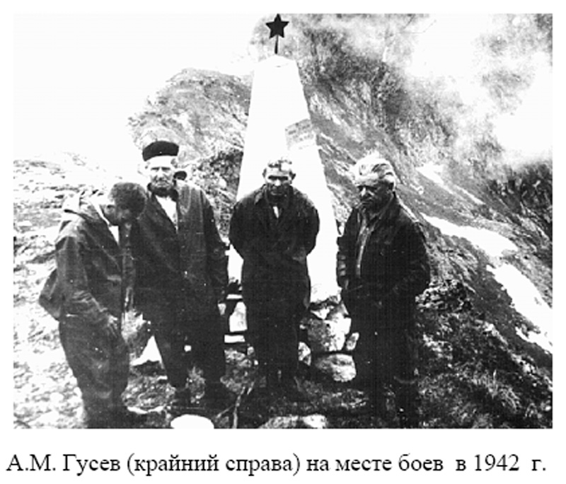 18 февраля 1943 г. — Гусев среди тех, кто сбрасывает фашистский флаг с Эльбруса и водружает над Кавказом алые знамена нашей Родины. Это о нем и его боевых товарищах: