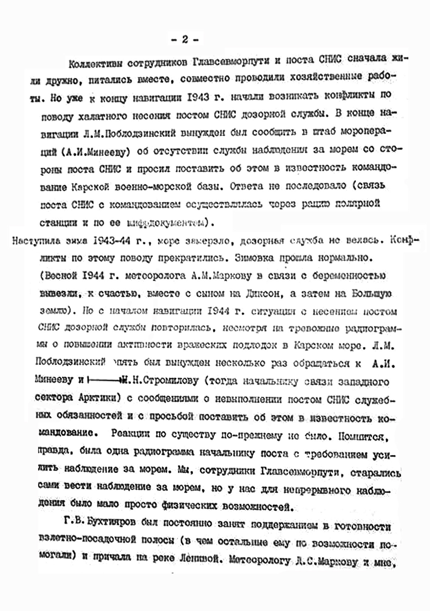 (часть строки вымарана) поста СНИС (службы наблюдения и связи) Карской военно-морской базы, располагавшейся на м.Стерлигова и преступно проспавшего (буквально!) высадку фашистского десанта; безосновательно возлагается вина на сотрудников Главсевморпути.
