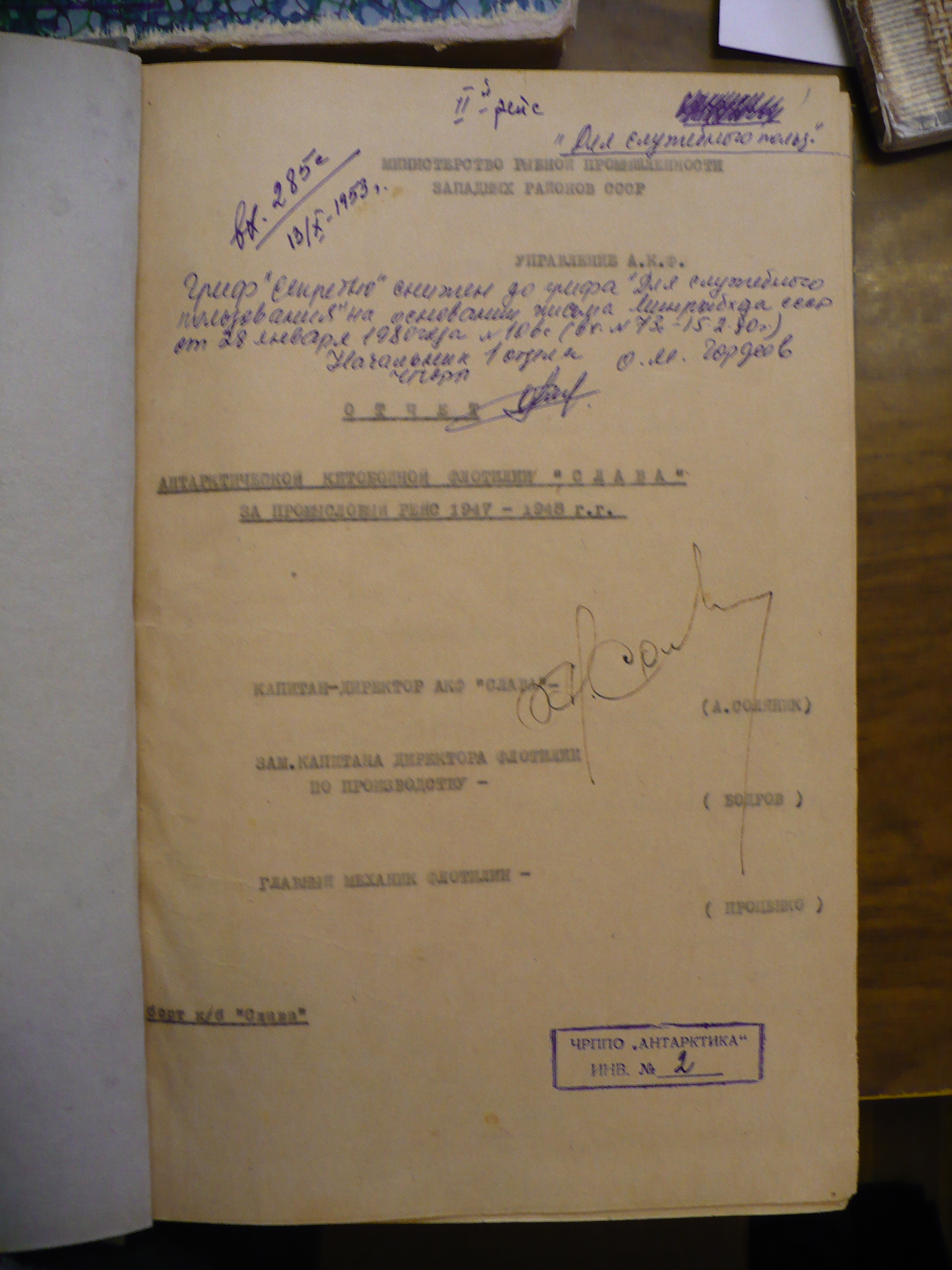 "В зиму 1946 и 1947 годов впервые в истории русского рыболовного флота суда советской китобойной экспедиции бороздили воды Антарктики, добывая китов. Экспедиция имела огромное значение: она доказала всему миру силу и мощь советского рыболовного флота, она изучила условия добычи китов в Антарктике, и, главное, она привлекла неиссякаемые богатства морей, омывающих Южный полюс, к использованию в плановом социалистическом хозяйстве нашей страны. Недавно возвратилась из дальнего плавания вторая экспедиция, осенью этого года уйдет третья. Китобойный промысел в Антарктике стал частью плана лова рыбы советского рыболовного флота.