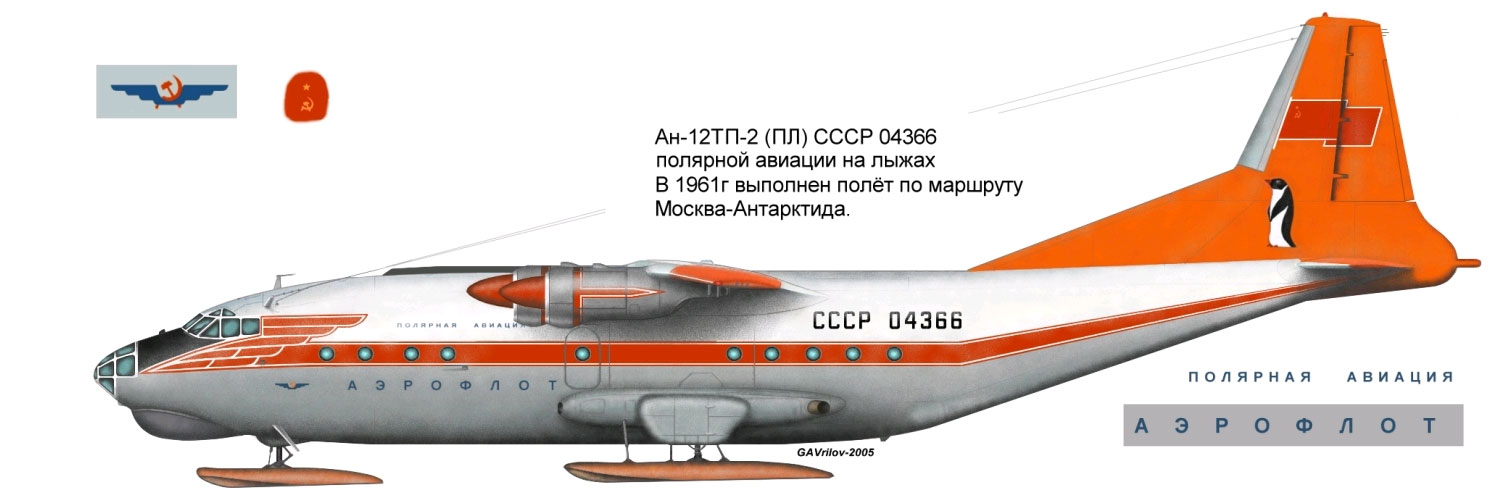 Написано что в базовой конфигурации Ан-12ТП-2 был самолетом для геофизических исследований и оснащен детектором магнитных аномалий на телескопической штанге в хвостовом конусе. На хвосте уже пингвин, а надписи Полярная авиация в носовой части еще нет.