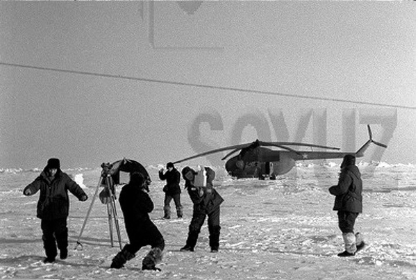 Групповой снимок участников дрейфа. П.А. Гордиенко - нач. 2-й смены - стоит 7-й слева. В.И. Шильников стоит крайний справа. А вот светлое пятно на хвостовой балке вертолета (ретушь снимка или на машине замазали) - это не попытка скрыть ту самую звезду? Может и не светится нигде номер вертолета на 1-2-й сменах станции, потому, что машина была вояковской?