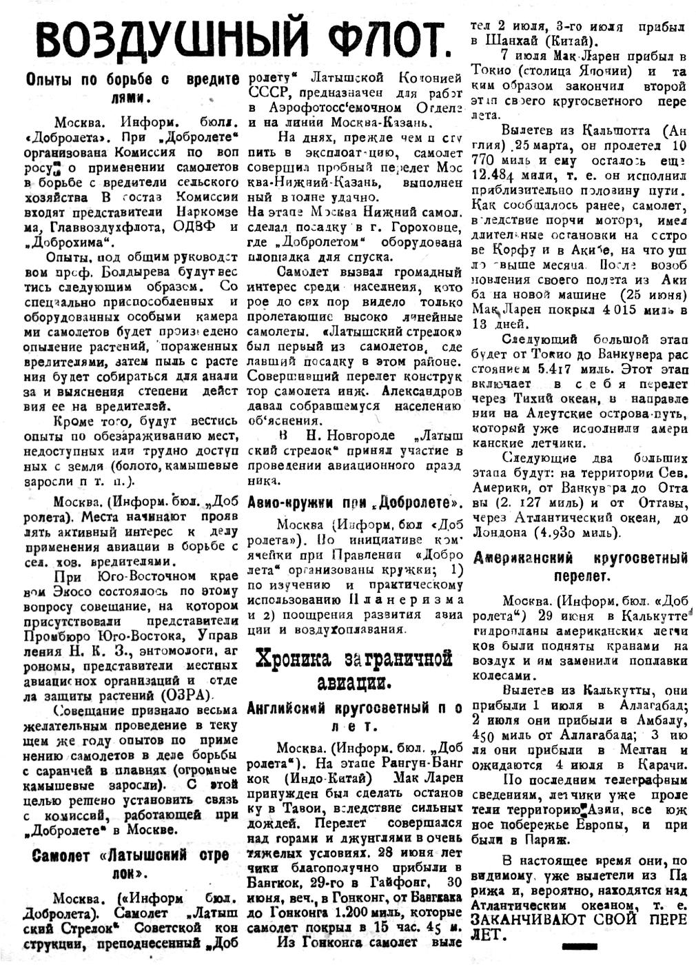 Москва. (Информ. бюллет. "Добролета"). Линия работает с 30 июня. Рейсы совершаются строго по расписанию. За первые 3 недели совершено 12 рейсов (туда и обратно). Покрыто в общей сложности 8916 километров.