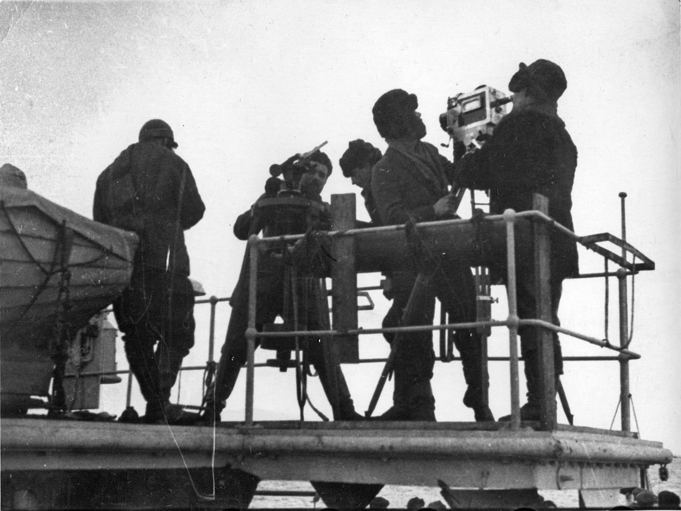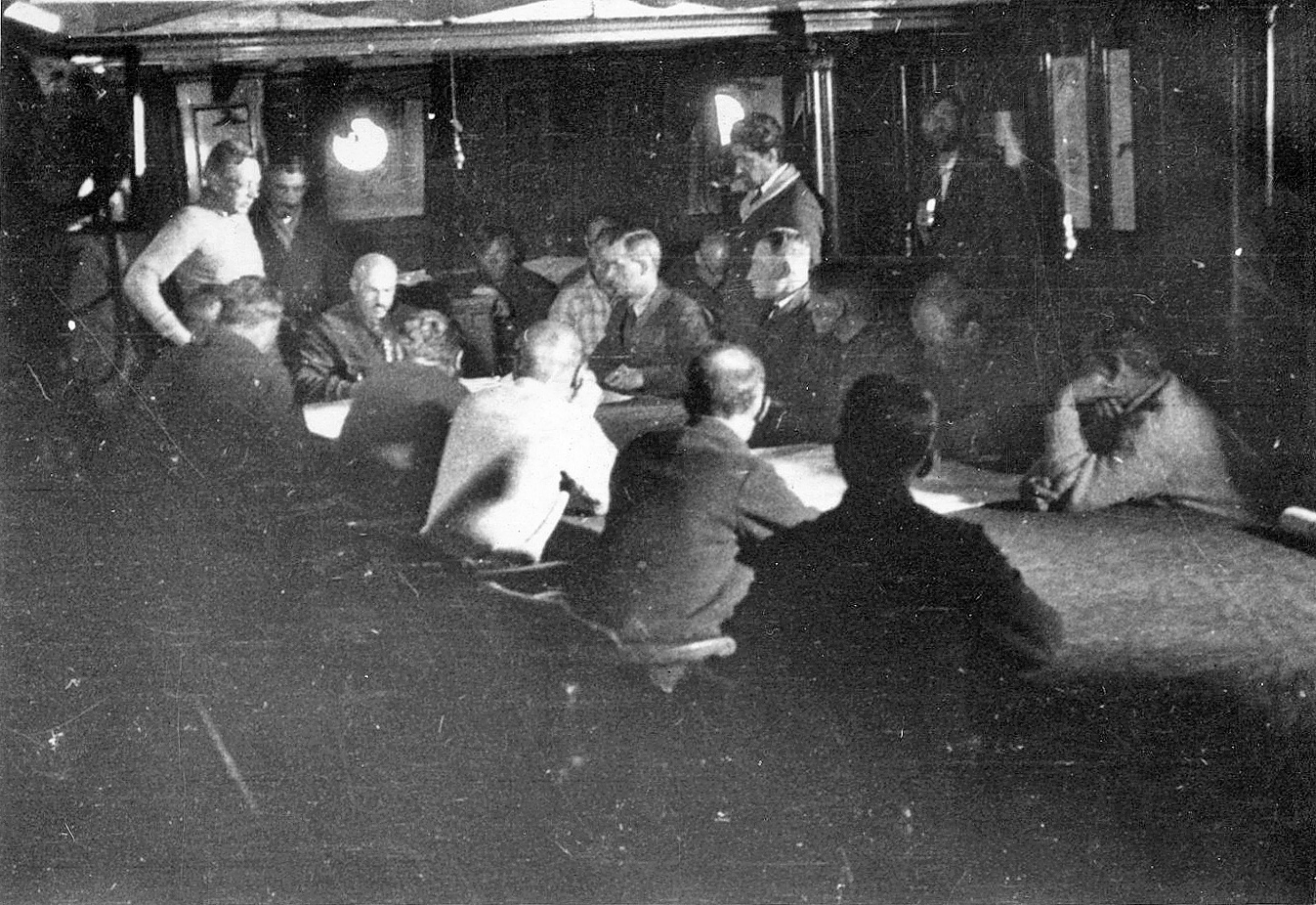 На третьей, за тем же столом снятый с другого ракурса человек с капитанскими нашивками. Вообще, большое количество людей на совещании и сидящий в отдалении человек с капитанскими нашивками дают основания предполагать, что во время съемки снимка в одном месте было достаточно большое количество судов.