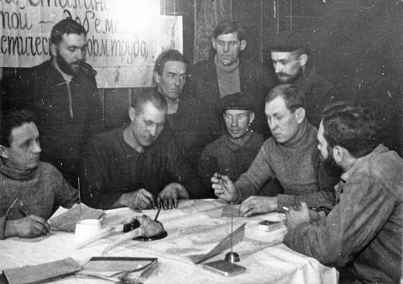 Единственная зацепка - карта вроде бы Таймыра, а у одного из запечатленных людей похоже знак "Спасательная Арктическая экспедиция 1928", т.е. кто-то из красинцев-участников.
