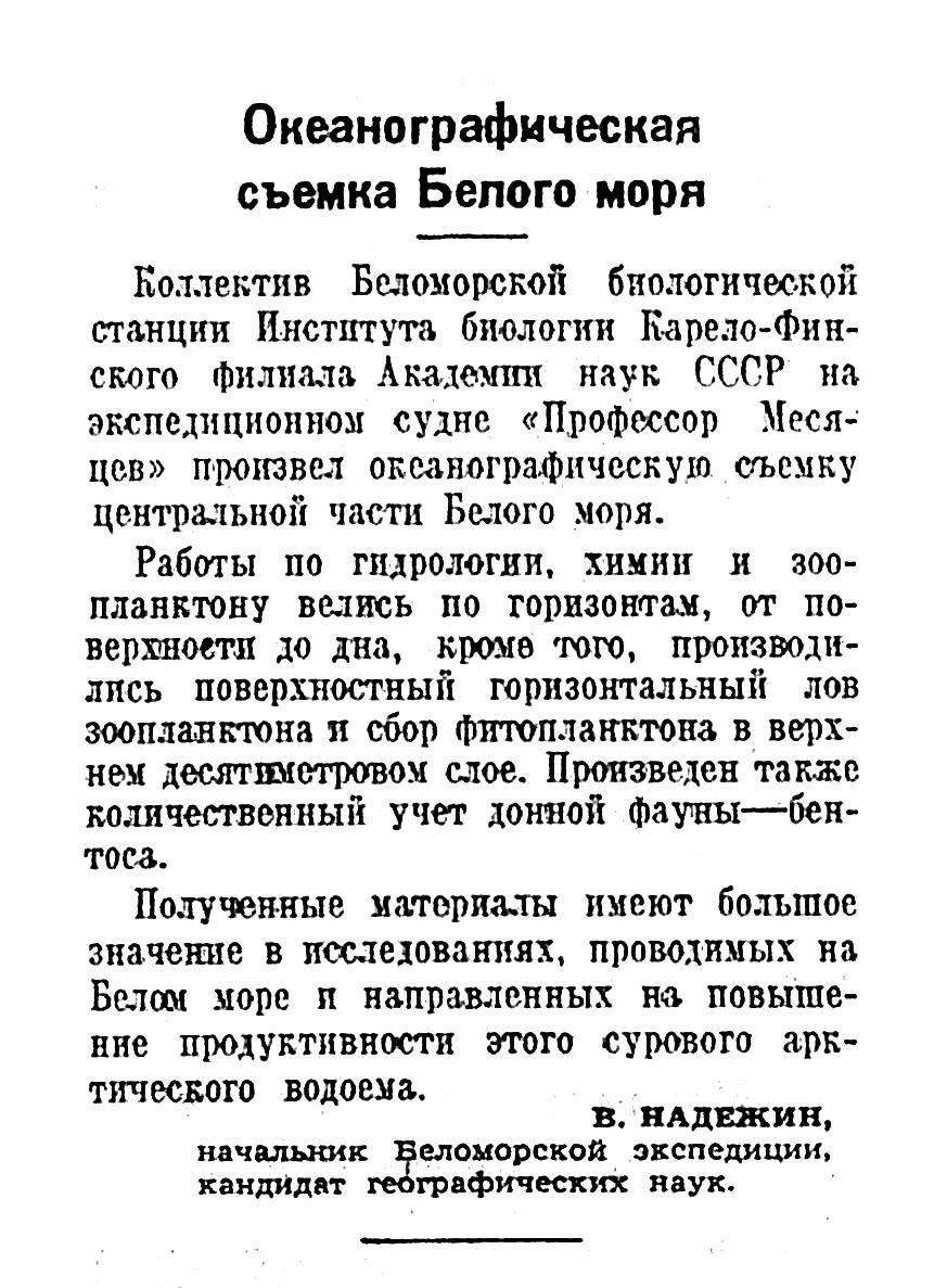 Коллектив Беломорской биологической станции Института биологии Карело-Финского филиала Академии наук СССР на экспедиционном судне «Профессор Месяцев» произвел океанографическую съемку центральной части Белого моря.