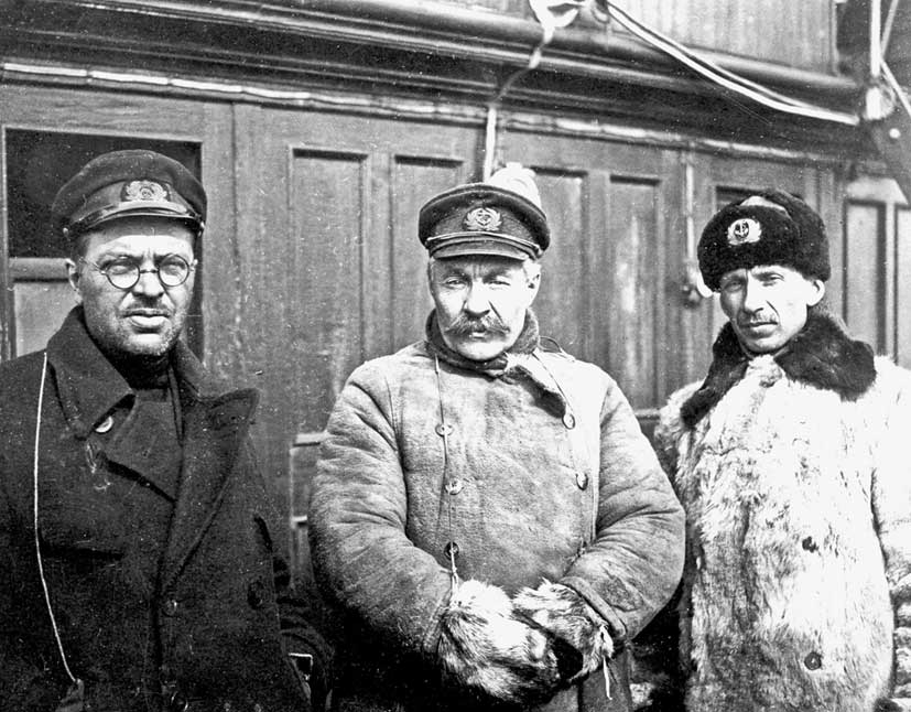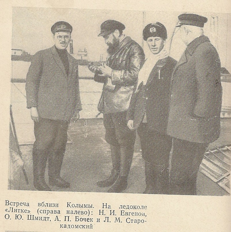 Спасибо :) Крайне интересная фотография. Судя по всему, это 1932 г, встреча "Сибирякова" и "Литке". Третий справа - Н. И. Евгенов, пятый, ес-сно О. Ю.Шмидт, восьмой, видимо, Б. Л. Исаченко, девятый - А. П. Бочек, капитан "Литке". На борту какого судна сделан снимок, неясно.