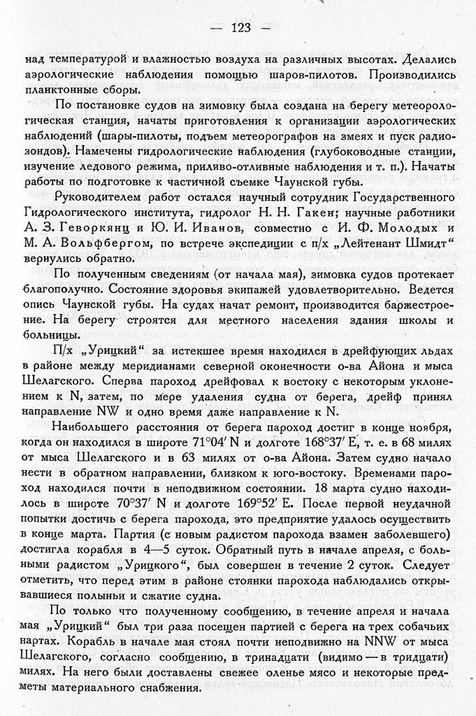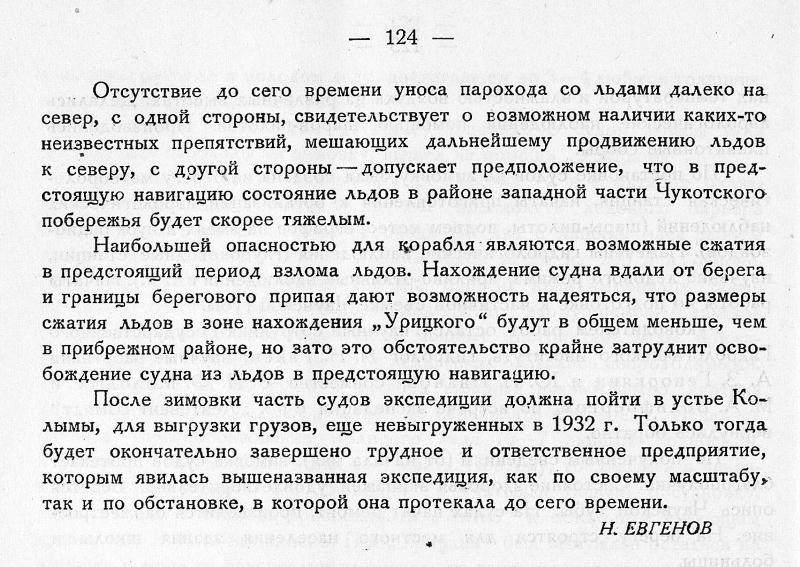 Наибольшей опасностью для корабля являются возможные сжатия в предстоящий период взлома льдов. Нахождение судна вдали от берега и границы берегового припая дают возможность надеяться, что размеры сжатия льдов в зоне нахождения „Урицкого“ будут в общем меньше, чем в прибрежном районе, но зато это обстоятельство крайне затруднит освобождение судна из льдов в предстоящую навигацию.