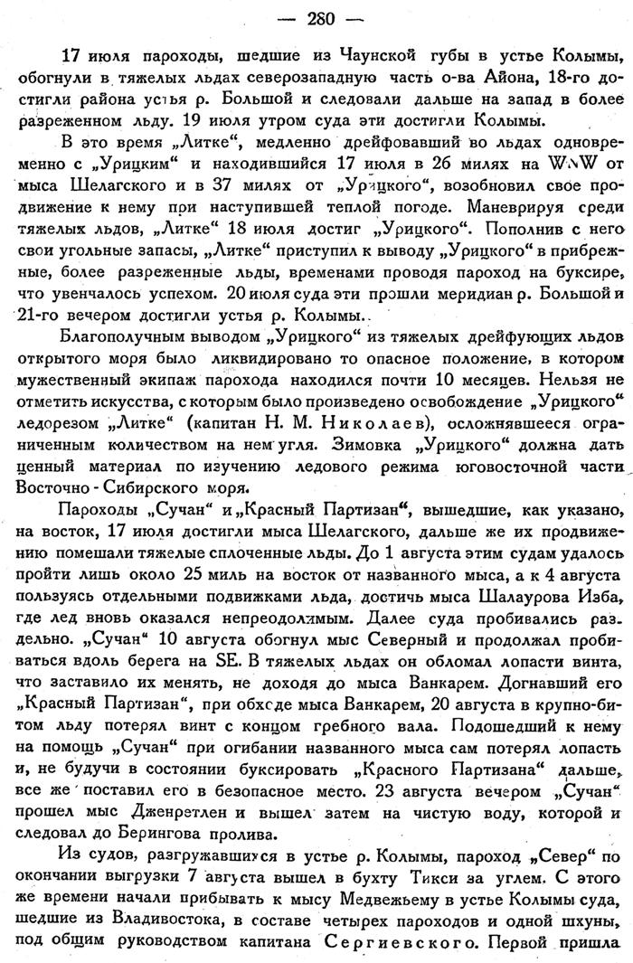 Благополучным выводом "Урицкого" из тяжелых дрейфующих льдов открытого моря было ликвидировано то опасное положение, в котором мужественный экипаж парохода находился почти 10 месяцев. Нельзя не отметить искусства, с которым было произведено освобождение "Урицкого" ледорезом "Литке" (капитан Н. М. Николаев), осложнявшееся ограниченным количеством на нем угля. Зимовка "Урицкого" должна дать ценный материал по изучению ледового режима юговосточиой части Восточно-Сибирского моря.