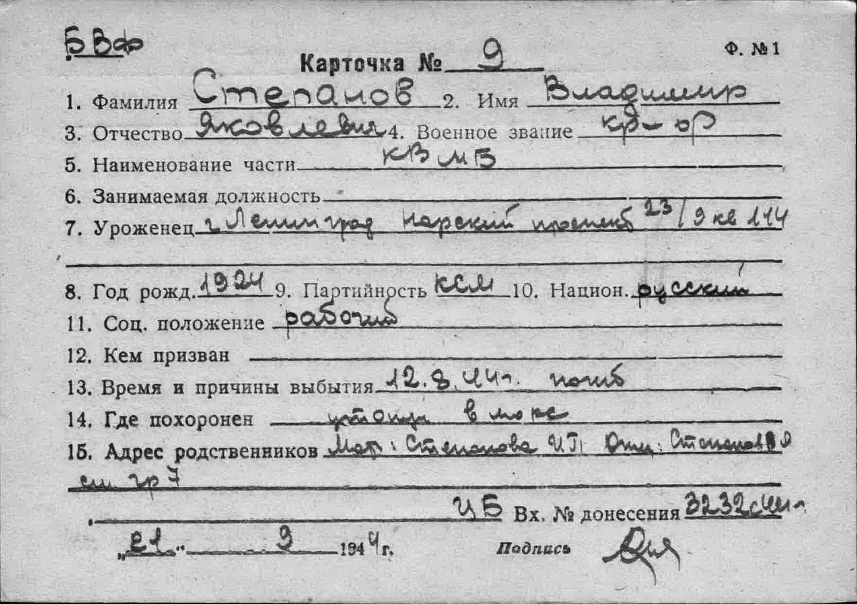 - 1. ЦВМА ф.3303 оп.21874 д.2: КВМБ Именной список ф. №2 безвозвратных потерь № 0282 от 2.09.1944 г.