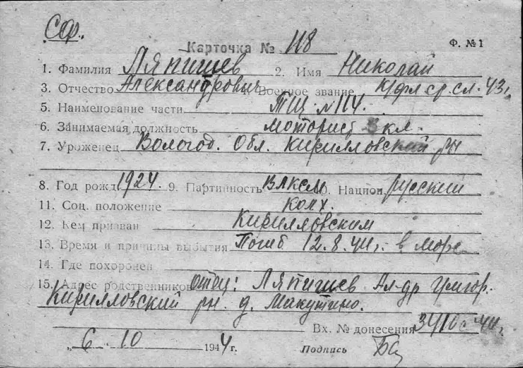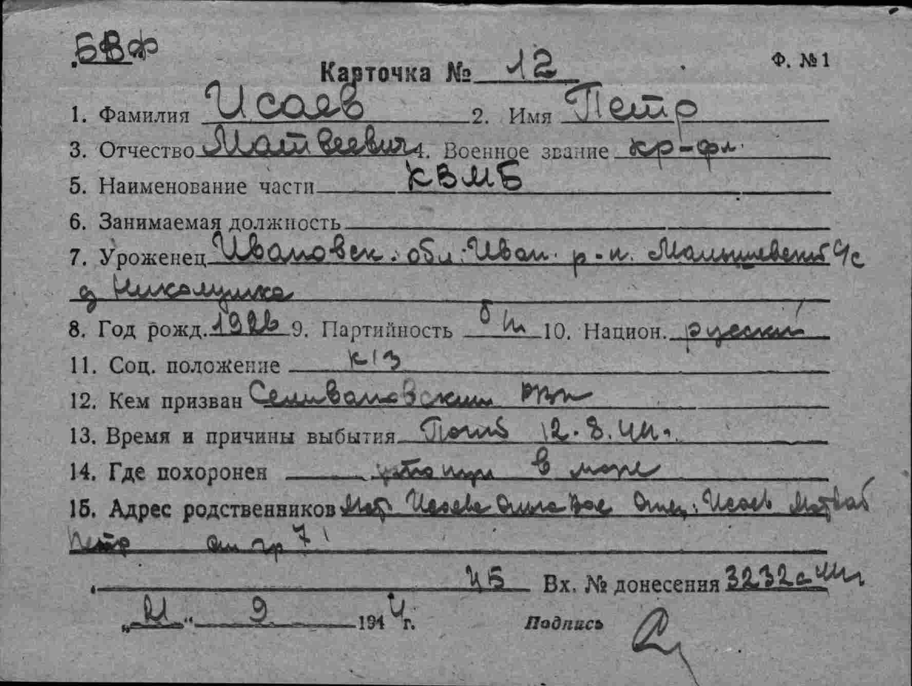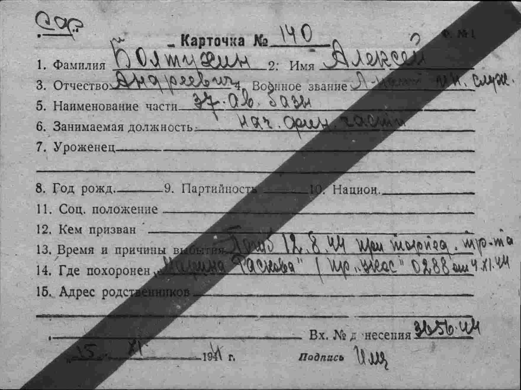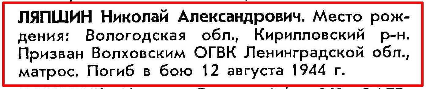 2. ЦВМА ф.12 оп.5 д.222 :Список безвозвратных потерь офицерского состава частей ВВС СФ и ВВС ГФ. Штаб ВВС СФ, ОКОС № 02127 от 22.09. (частично, только по БД-5).