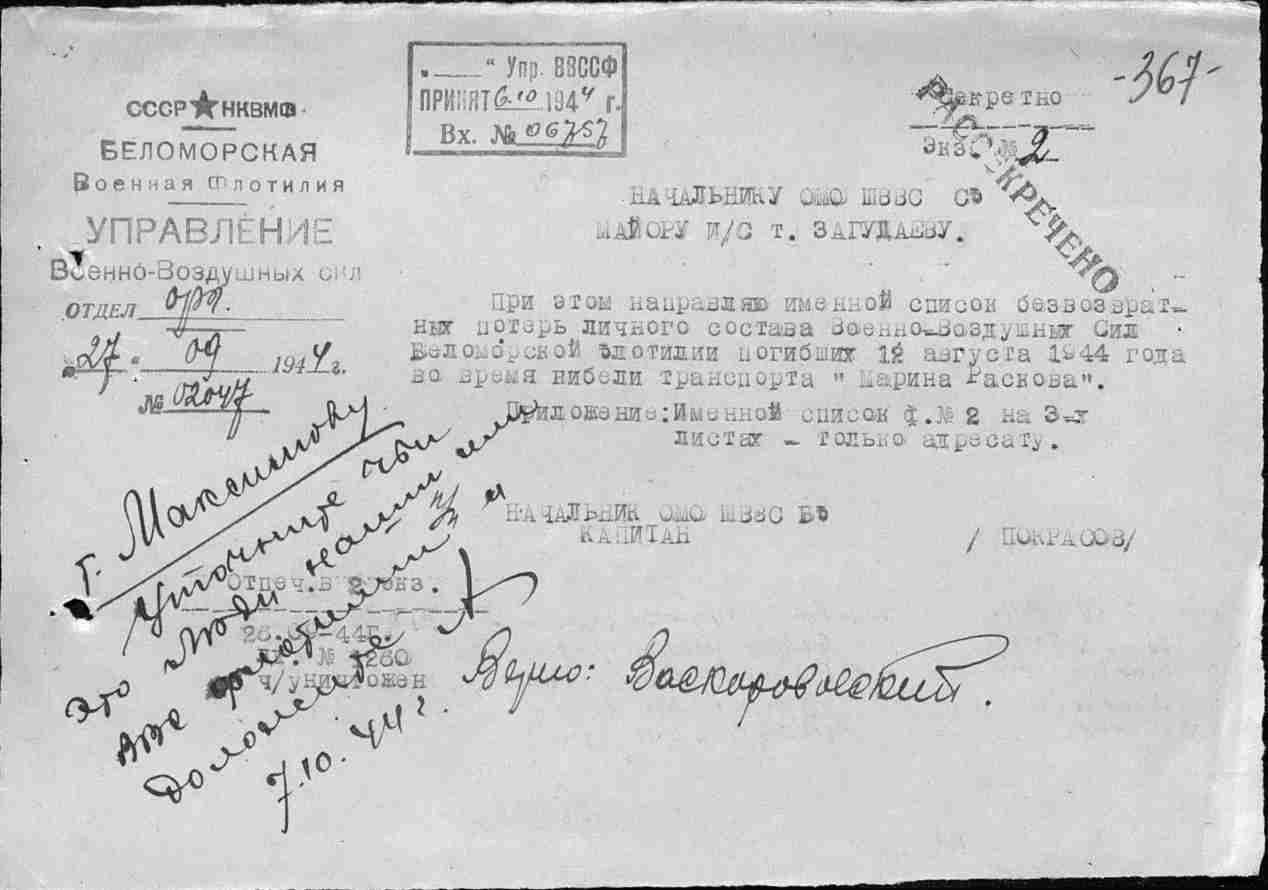Донесения о безвозвратных потерях №6/01073 от 23.09.1944 г. ОРСО СФ (вх.3410с от 03.10.1944 УПК ВМФ)