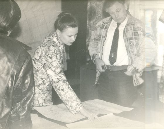 Синоптик-среднесрочник Горлова Елена Николаевна и гидролог-авиаразведчик Спирин С. А. (стоит спиной) докладывают гидрометобстановку начальнику морских операций Востока Арктики Жеребятьеву Владимиру Петровичу (сентябрь, 1994г.)
