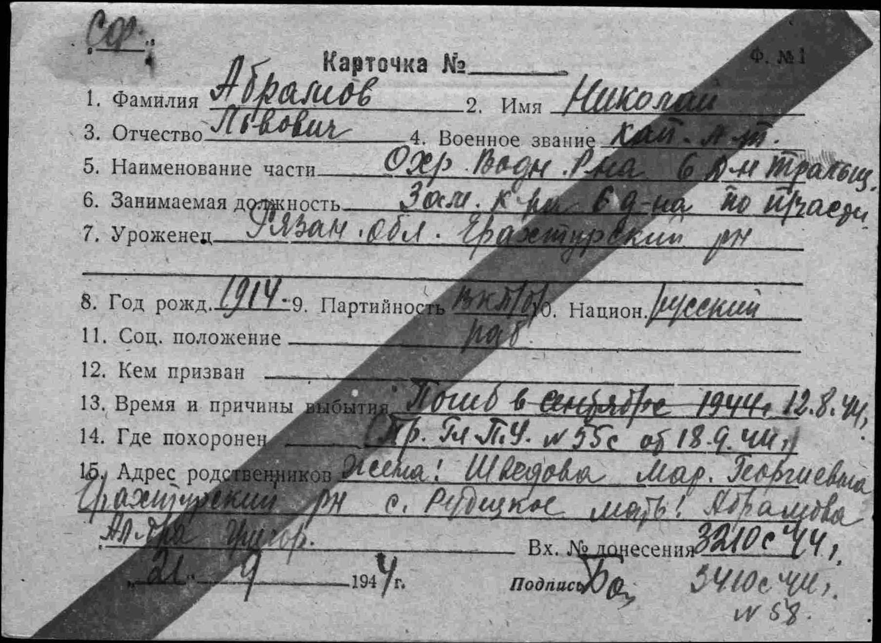 2. Абрамов Николай Львович, воинское звание – капитан-лейтенант; должность, часть – заместитель командира по политической части 6 ДТЩ Бригада траления ОВР ГБ СФ; год рождения – 1914; место рождения – Рязанская обл., Ерахтурский р-н, с. Рудецкое (ныне – территория Шиловского р-на); партийность – член ВКП (б); социальное положение – рабочий; национальность – русский; служба в армии – в РККА с 1936 (1938) г.; награды – орден Красной Звезды; по какой причине, где и когда выбыл – погиб в море при выполнении боевого задания 12.08.1944 г.; семейное положение – женат; родственники (ФИО, адрес) – жена, Шведова Мария Георгиевна, мать, Абрамова Александра Григорьевна, проживают по месту рождения погибшего; дополнительная информация – по факту гибели назначена пенсия матери с 01.09.1944 в сумме 426 руб.