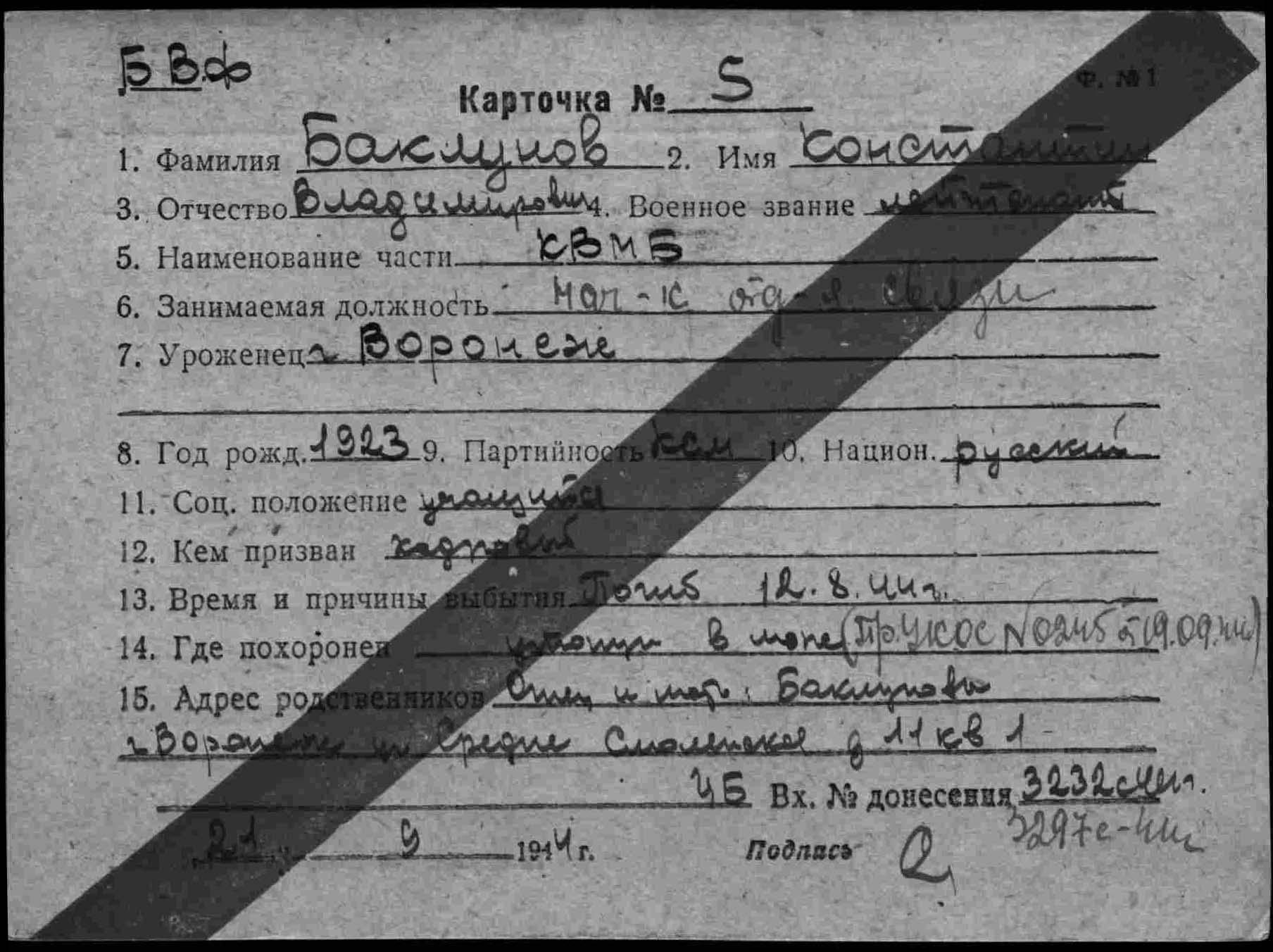 2. ЦВМА ф.12 оп.5 д.222 :Список безвозвратных потерь офицерского состава частей ВВС СФ и ВВС ГФ. Штаб ВВС СФ, ОКОС № 02127 от 22.09. (частично, только по БД-5).