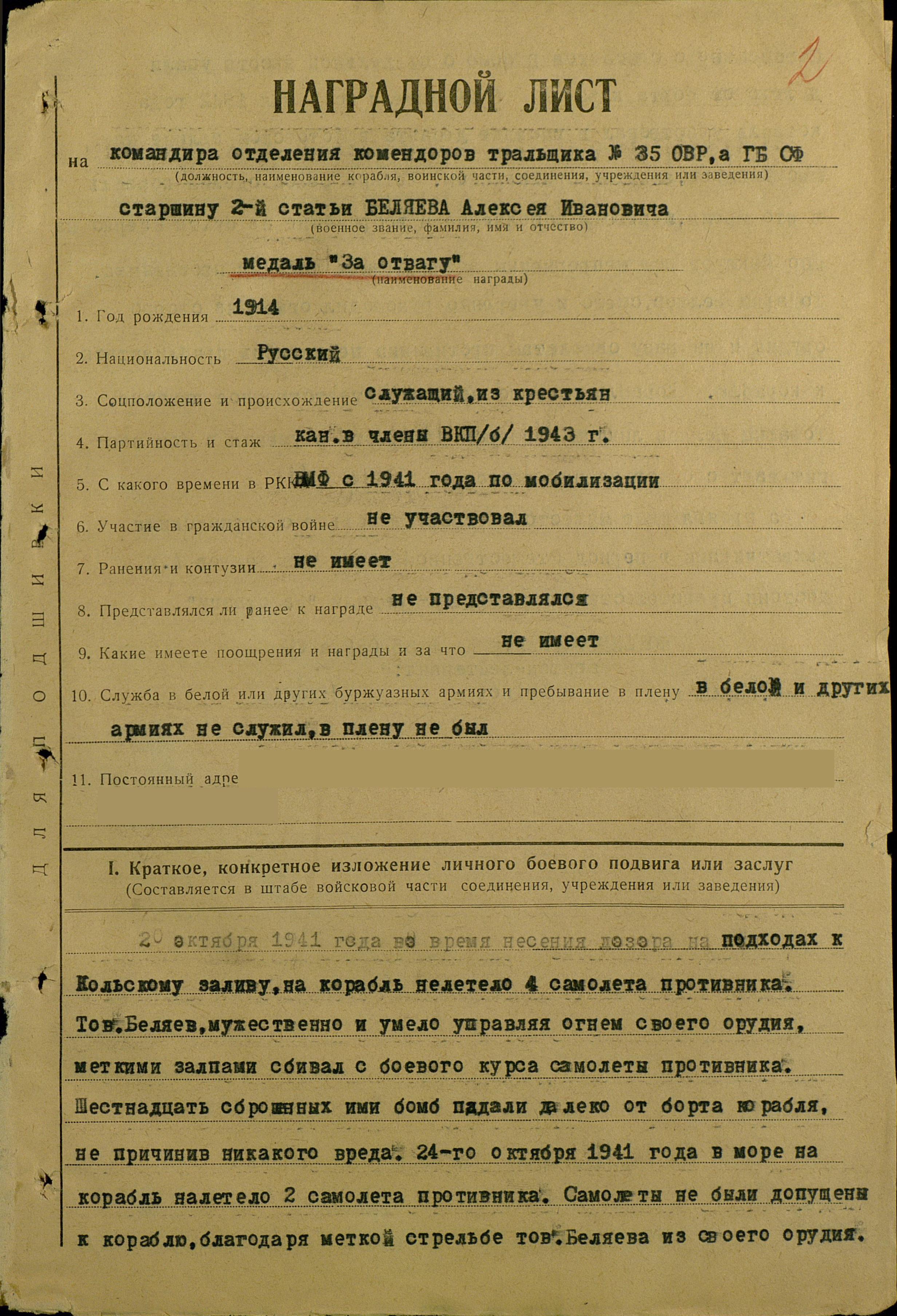 20 октября 1941 г. во время несения дозора на подходах к Кольскому заливу на корабль налетело 4 самолета противника. Тов. Беляев, мужественно и умело управляя огнем своего орудия, меткими залпами сбивал с боевого курса самолеты противника. 16 сброшенных ими бомб падали далеко от борта корабля, не причинив никакого вреда [судну]. 24 октября 1941 г. в море на корабль налетало 2 самолета противника. Самолеты не были допущены к кораблю, благодаря меткой стрельбе тов. Беляева из своего орудия. Сброшенные с самолетов 8 бомб с предельной высоты упали далеко от борта корабля. С 28 апреля по 1 мая 1942 г. корабль участвовал в высадке десанта в Мотовском заливе на мыс Пикшуева, занятым противником. Четыре рейса сделал корабль в это время, перевозя пополнение и вооружение из бухты Озерко на мыс Пикшуева под непрерывным воздействием авиации противника. Товарищ Беляев смело и уверенно руководил огнем из своего орудия, и ни разу самолетам противника не удалось приблизиться к кораблю. Корабль успешно выполнил ответственное задание. Товарищ Беляев личным примером храбрости и умения […] в бою воспитывает свой орудийный расчет.