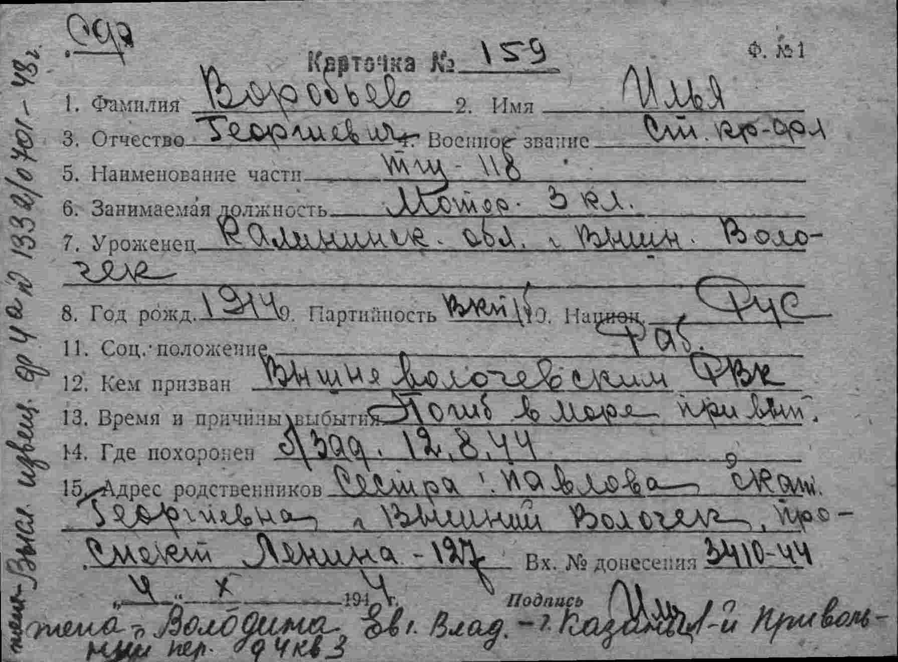 Донесение о безвозвратных потерях 3410 от 03.10.1944 (ЦВМА, Ф. 864, О. 1, Д. 1358).