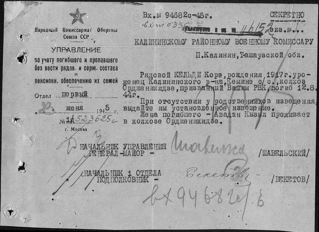 Донесение о безвозвратных потерях 94682 от 14.06.1945 (ЦАМО, Ф. 58, О. 18003, Д. 803).