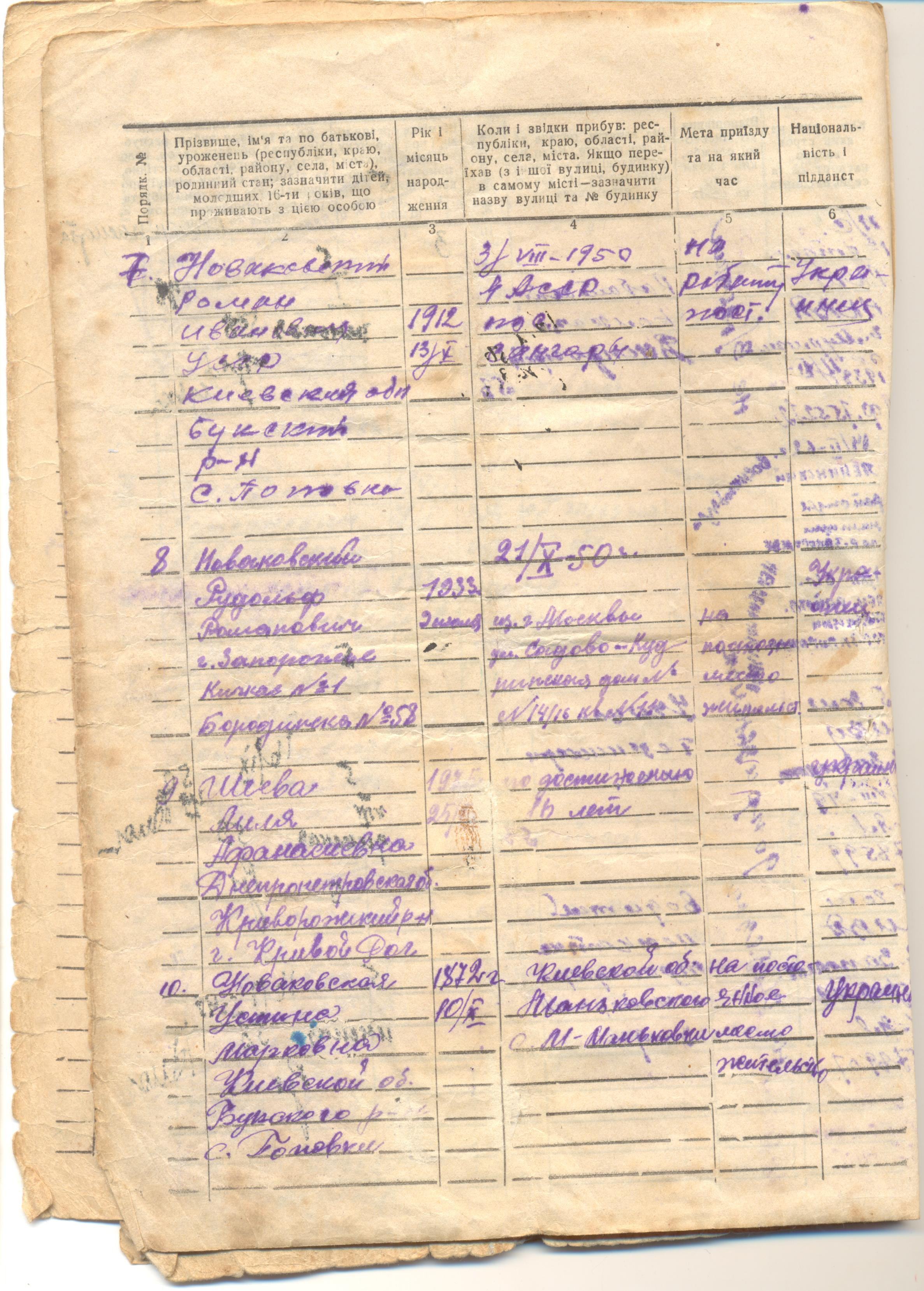 Фамилия, имя, отчество, место рождения (республика, край, область, район, село, город), семейное положение; указать детей, младших 16-ти лет, которые живут с этим человеком: Новаковский Роман Иванович, УССР, Киевская обл., Букский р-н, с. Поповка; год и месяц рождения: 13.10.1912 г.; когда и откуда прибыл: республика, край, область, район, село, город, если переехал (с другой улицы, дома) в самом городе – указать название улицы и № дома: 03.08.1950 г., Якутская АССР, пос. Сангары; цель переезда и на какой срок: на работу постоянную; национальность и подданство: украинец.