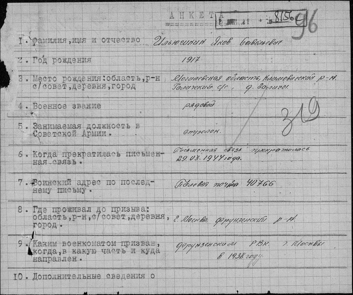 80. Ильюшкин Яков Савельевич, дата рождения – 1917 г.; место рождения – Белорусская ССР, Могилевская обл., Климовичский р-н, Галичский с/с, д. Галичи; дата и место призыва – 1938 г., Фрунзенский РВК, Московская обл., г. Москва, Фрунзенский р-н; последнее место службы – п/п 40766; воинское звание – рядовой; причина выбытия – пропал без вести; дата выбытия – не ранее 29.03.1944; родственники – мама - Ильюшкина Евдокия Марковна; где проживают родственники (подробный адрес) – Могилевская обл., Климовичский р-н, Галичский с/с, д. Галичи; архив – ЦАМО; номер фонда – 58; номер описи – 977522; номер дела – 90.