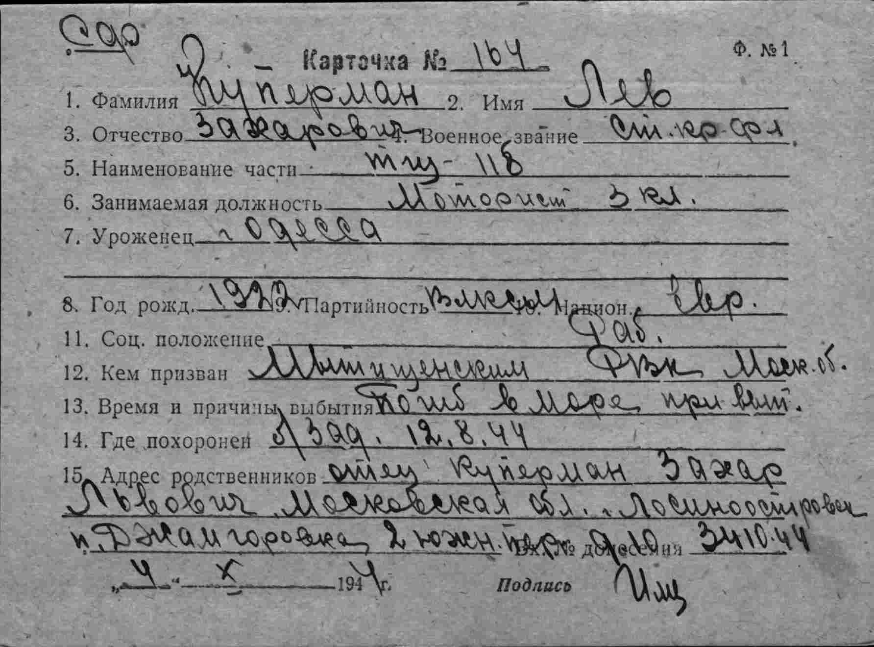 Донесение о безвозвратных потерях 3410 от 03.10.1944 (ЦВМА, Ф. 864, О. 1, Д. 1358).