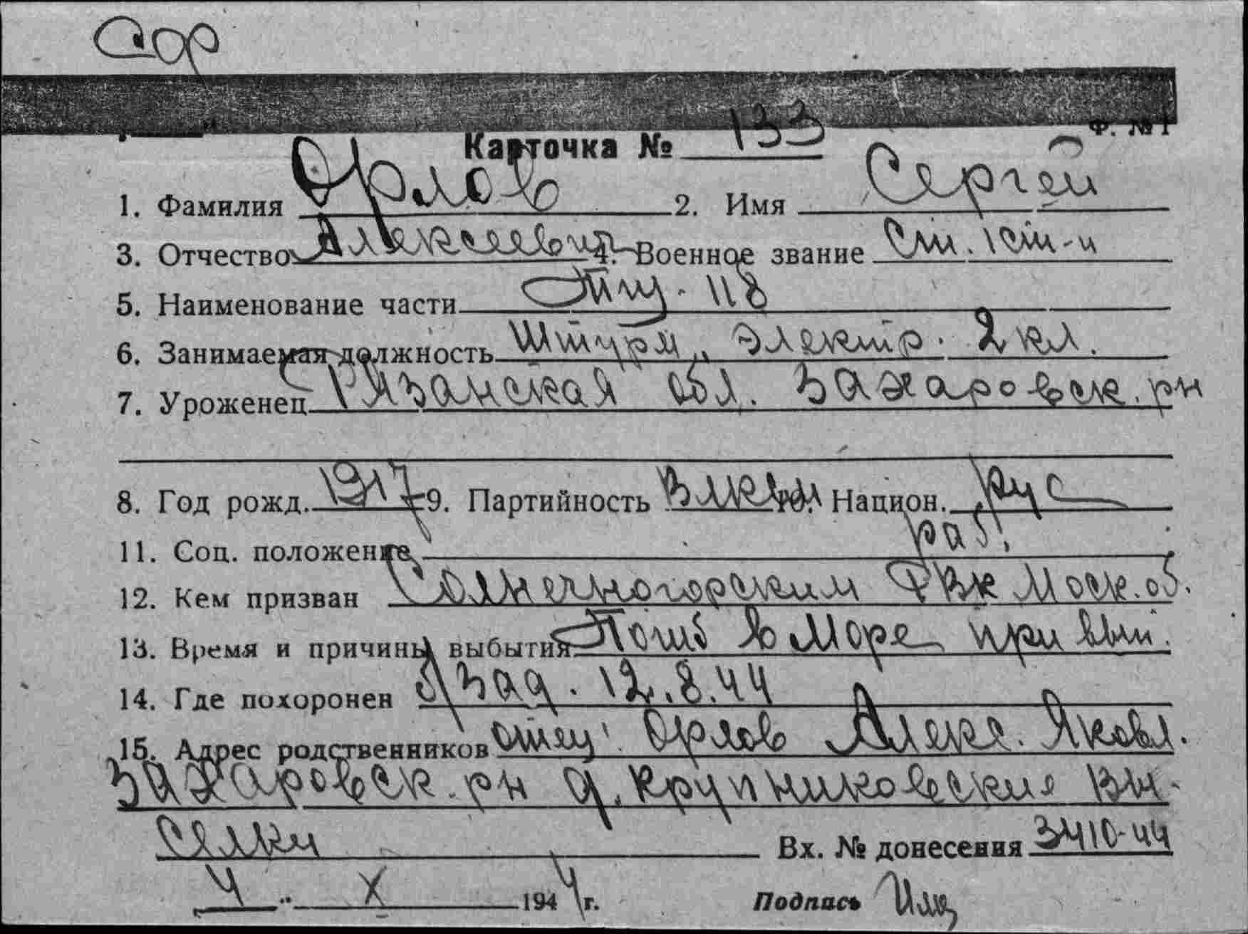 штурманский электрик, ТЩ-113 ОВР СФ); год рождения – 1917; место рождения – Рязанская обл., Захаровский р-н; партийность – член ВЛКСМ