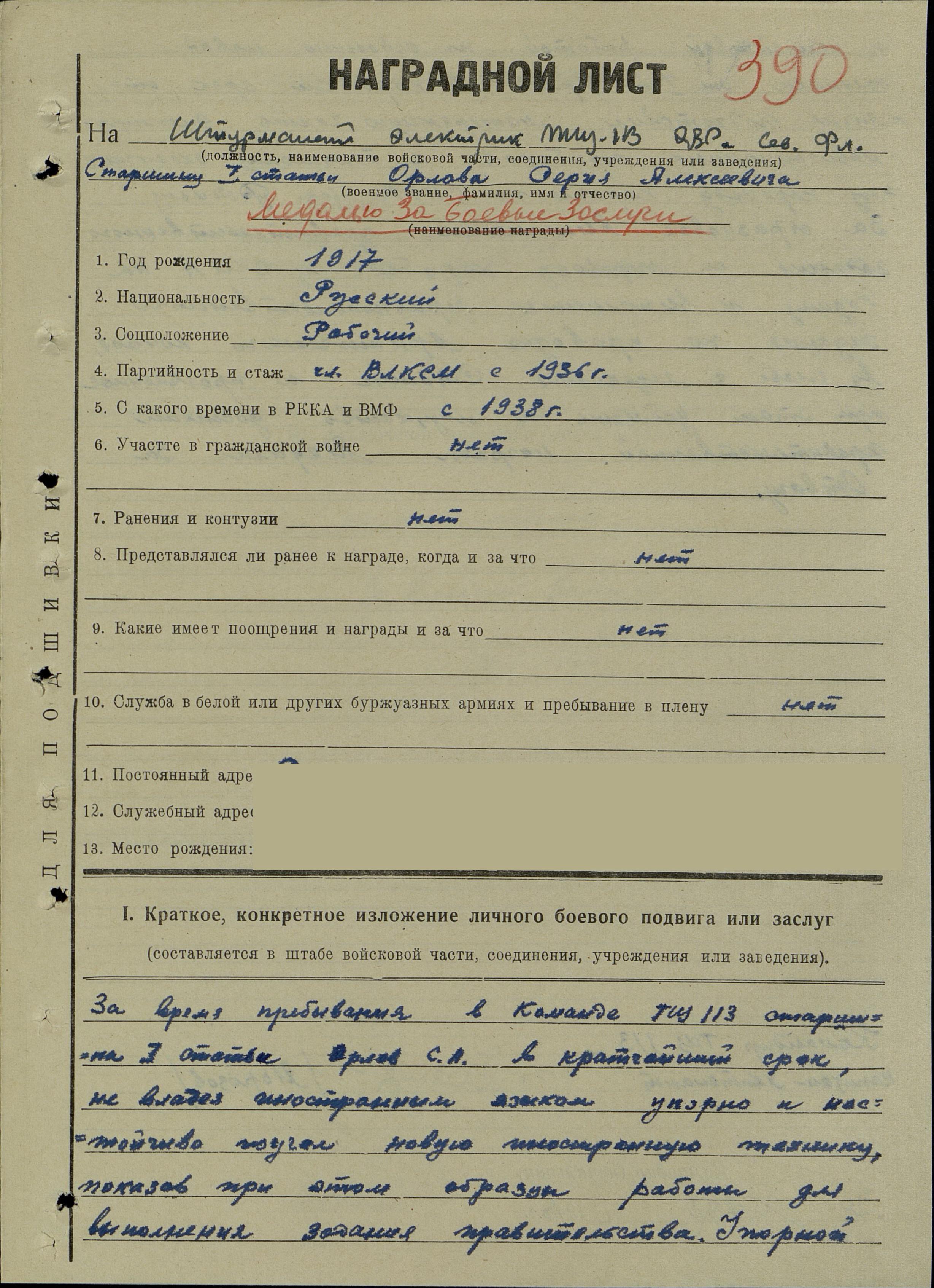 награды – медаль «За боевые заслуги»; по какой причине, где и когда выбыл – погиб в море при выполнении боевого задания 12.08.1944 г.; семейное положение – холост; родственники (ФИО, адрес) – отец, Орлов Алексей Яковлевич, Захаровский р-н, д. Крупниковские Выселки;