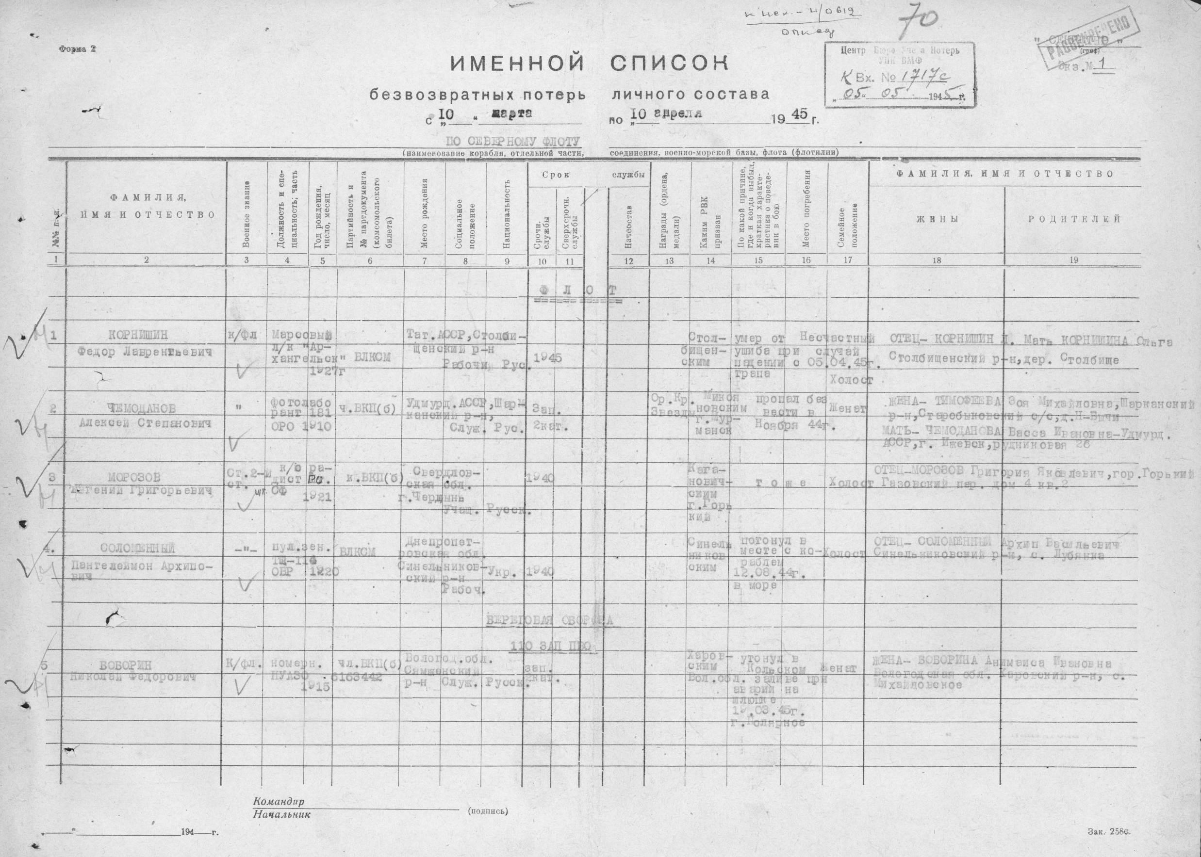 Донесения о безвозвратных потерях 1717 от 05.05.1945 г. ОПК СФ.