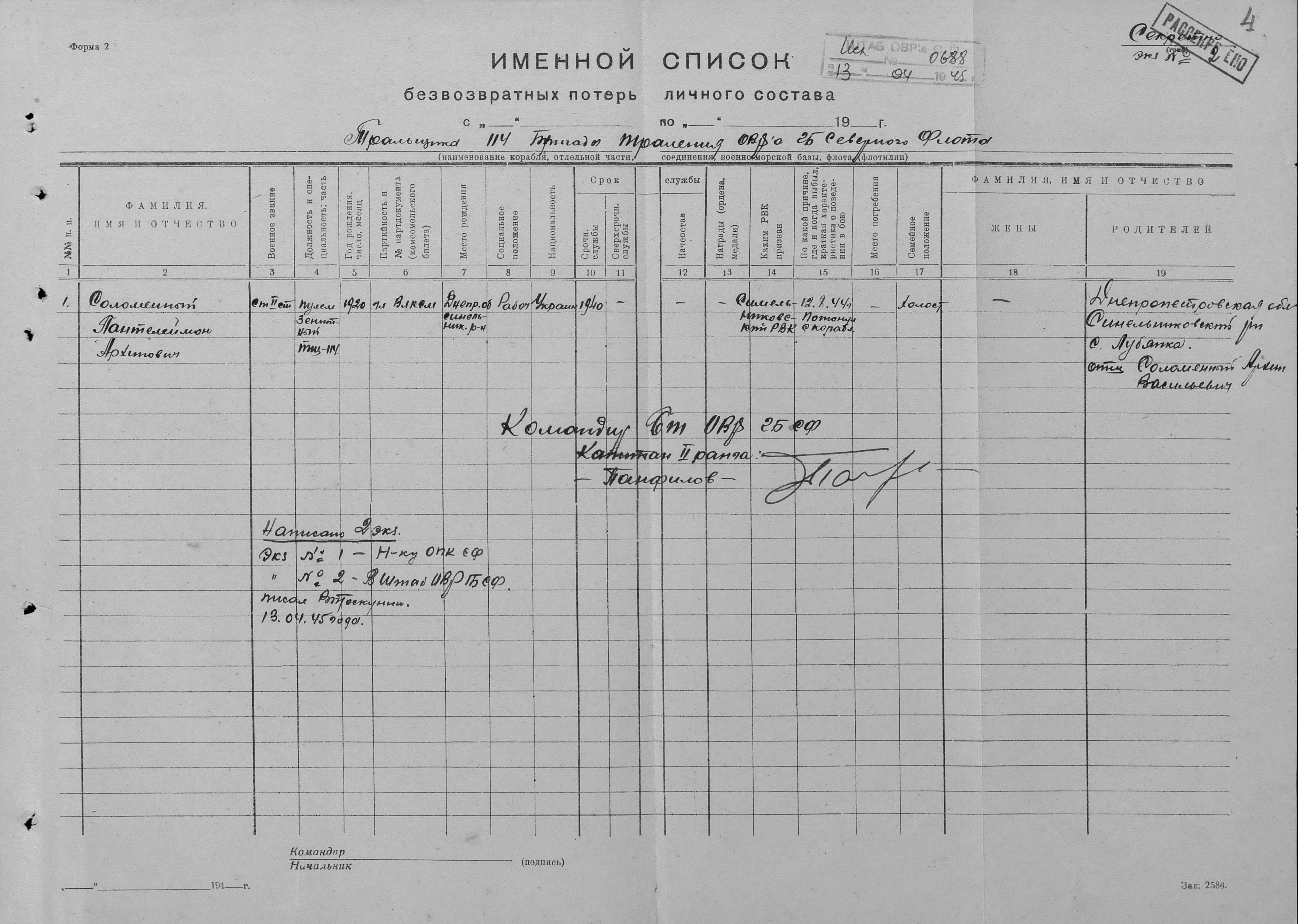 Донесения о безвозвратных потерях исх. 688 от 13.04.1945 г. ОПК СФ.
