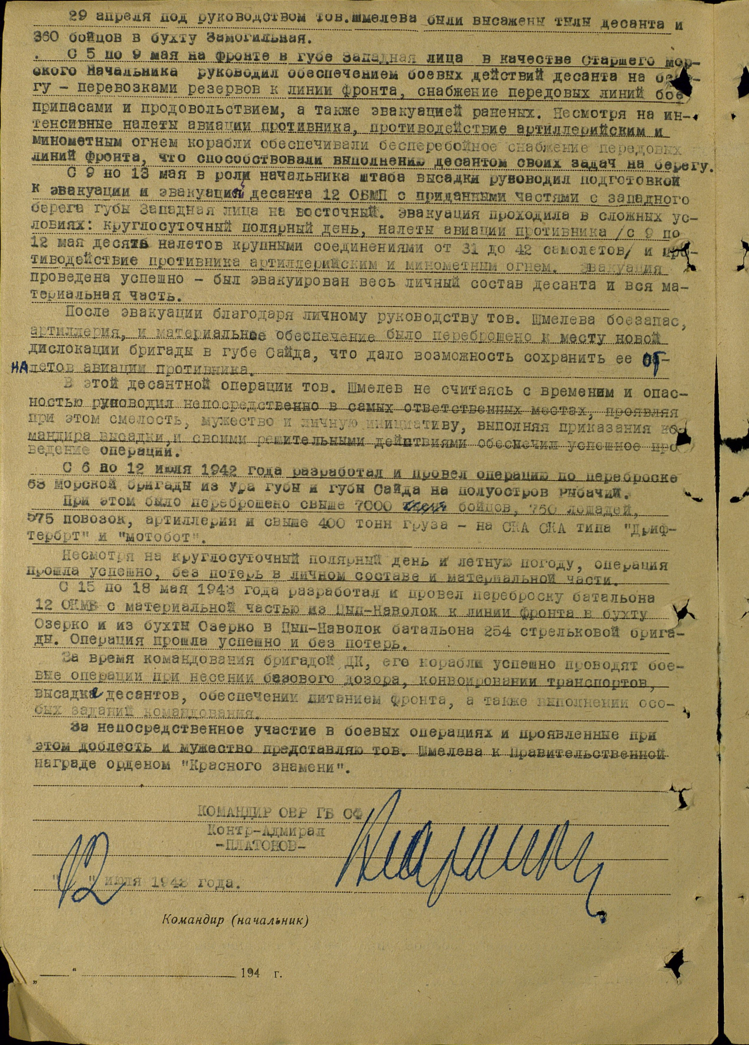 За непосредственное участие в боевых операциях и проявленные при этом доблесть и мужество представляю тов. Шмелева к правительственной награде – ордену Красного Знамени.