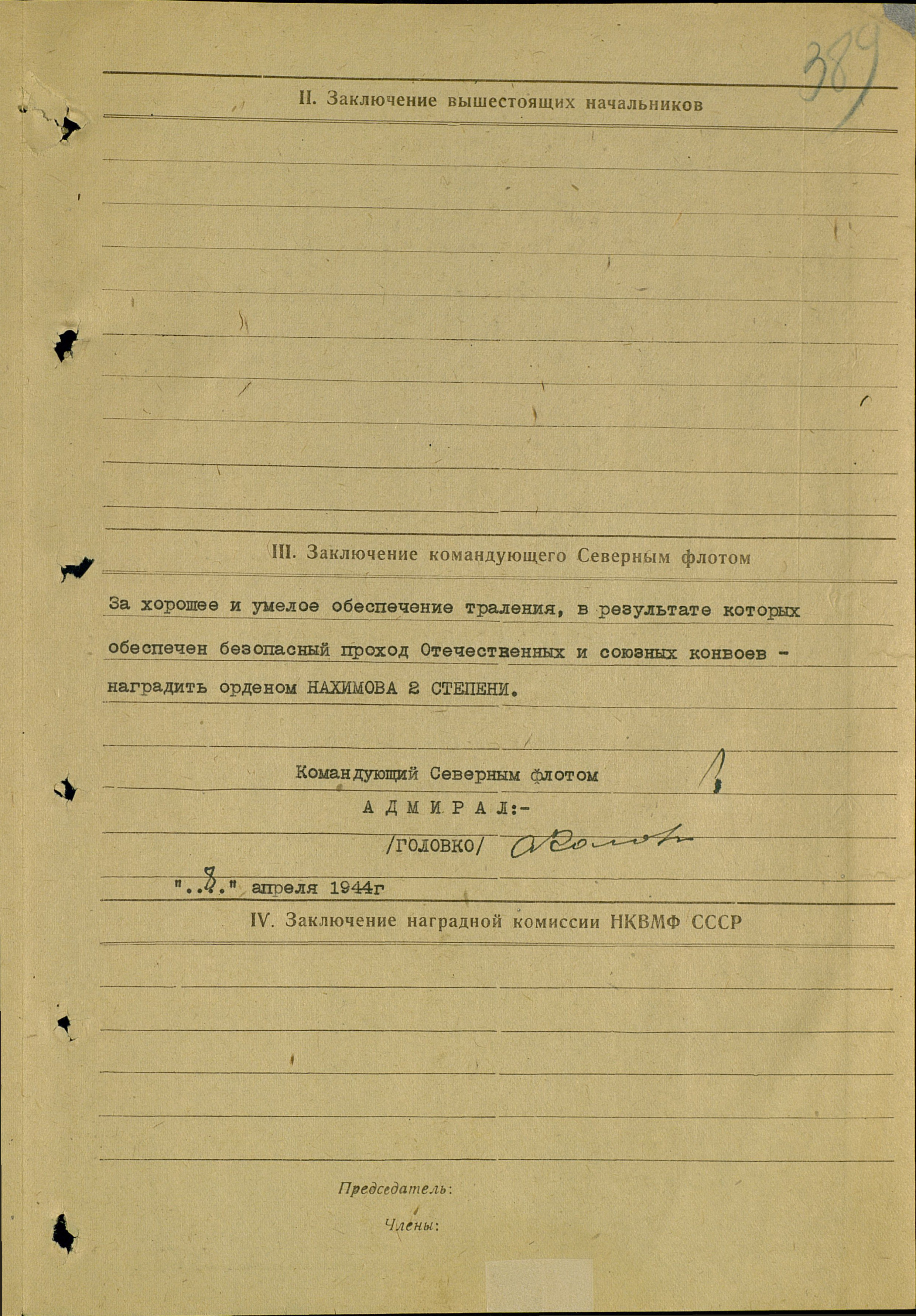 За руководство успешными боевыми действиями кораблей своей бригады и за большую работу, проделанную на пользу победы над врагом, представляю тов. Шмелева к правительственной награде – ордену Ушакова II степени.